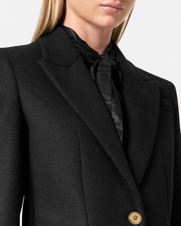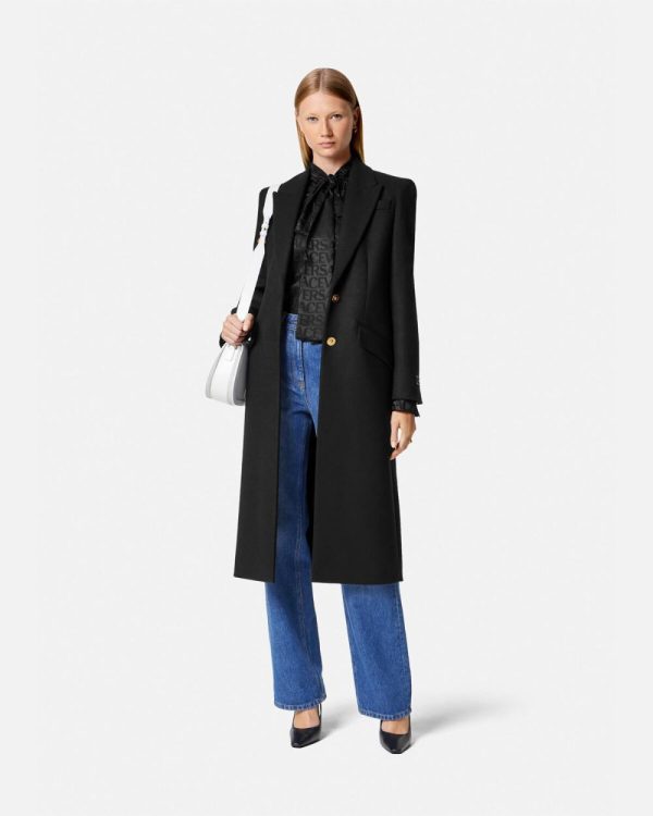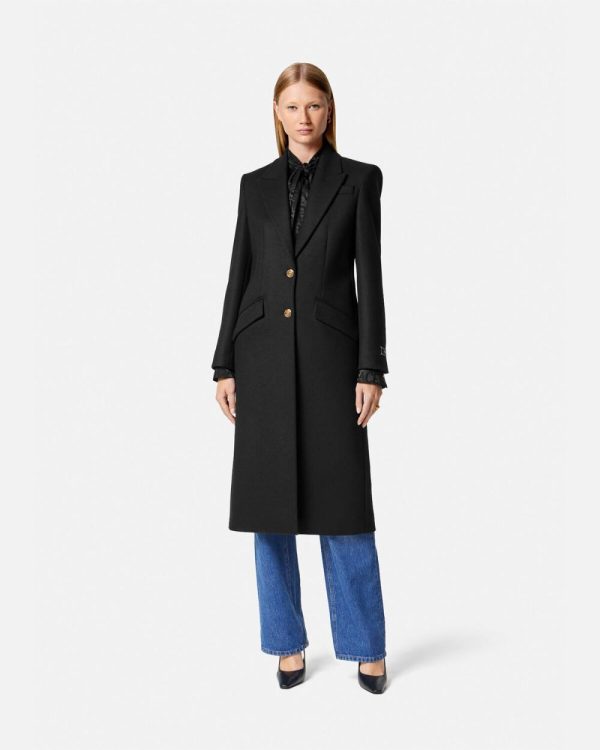 This lightly felted wool coat is fully lined in a single-breasted silhouette with notched lapels and accent Medusa buttons.