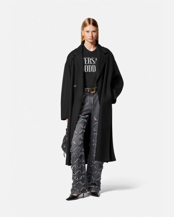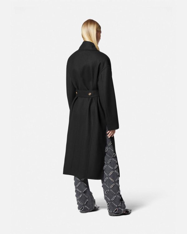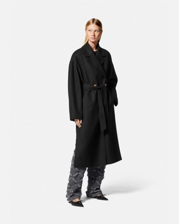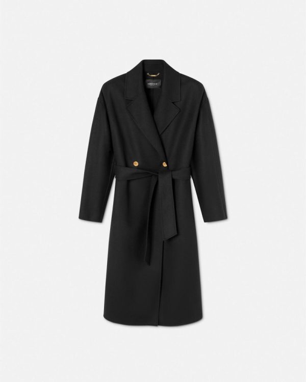 A soft take on outerwear, this belted coat is crafted from warm, double-faced wool in an unlined construction. The double-breasted style is accented by Medusa buttons with dropped shoulders and a notched lapel.