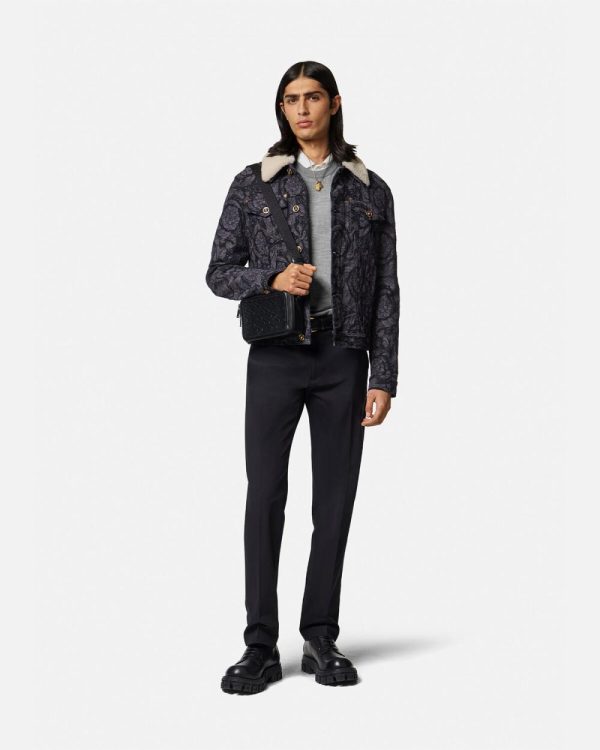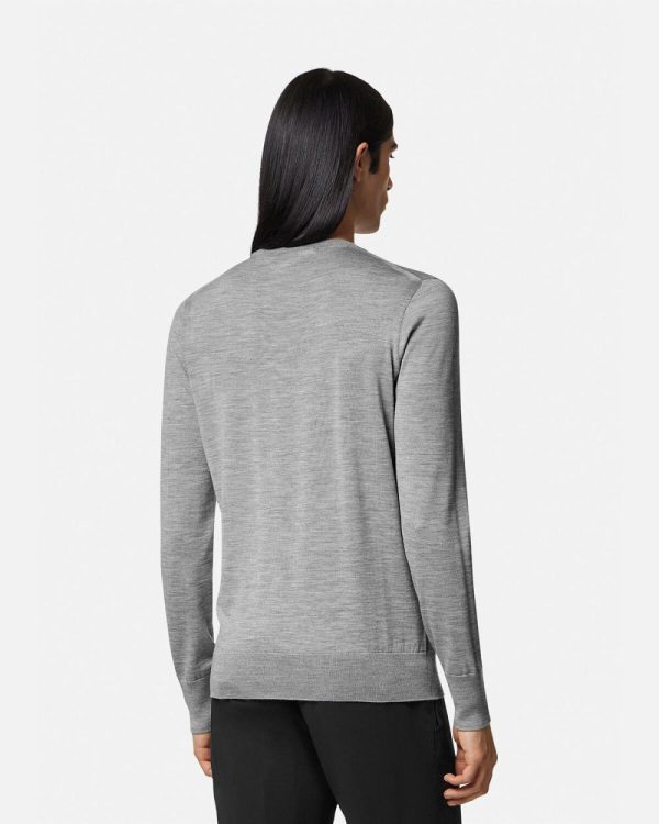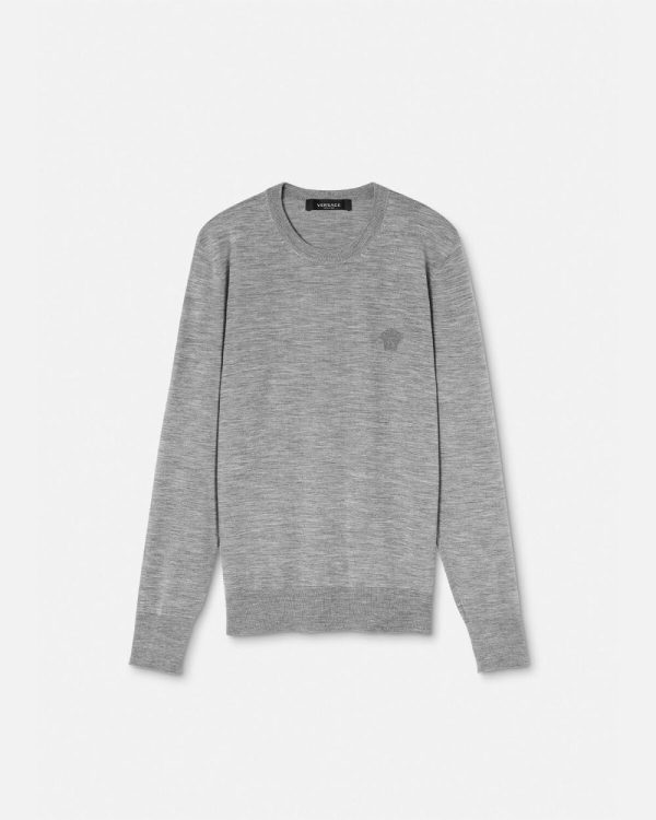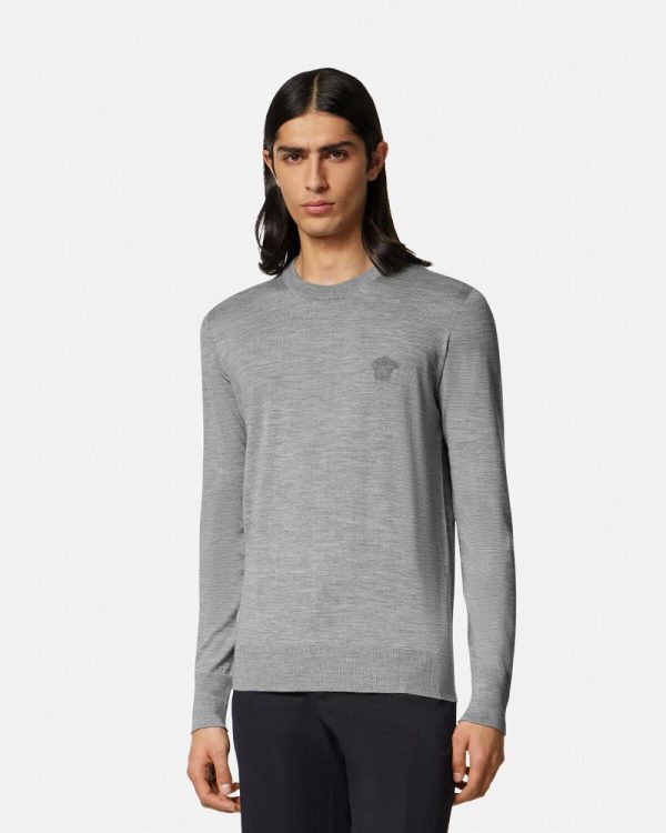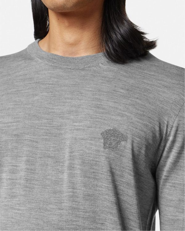 Knit from a lightweight wool, silk and cashmere blend, this long-sleeved crewneck sweater features a tonal embroidered Medusa logo at the chest.