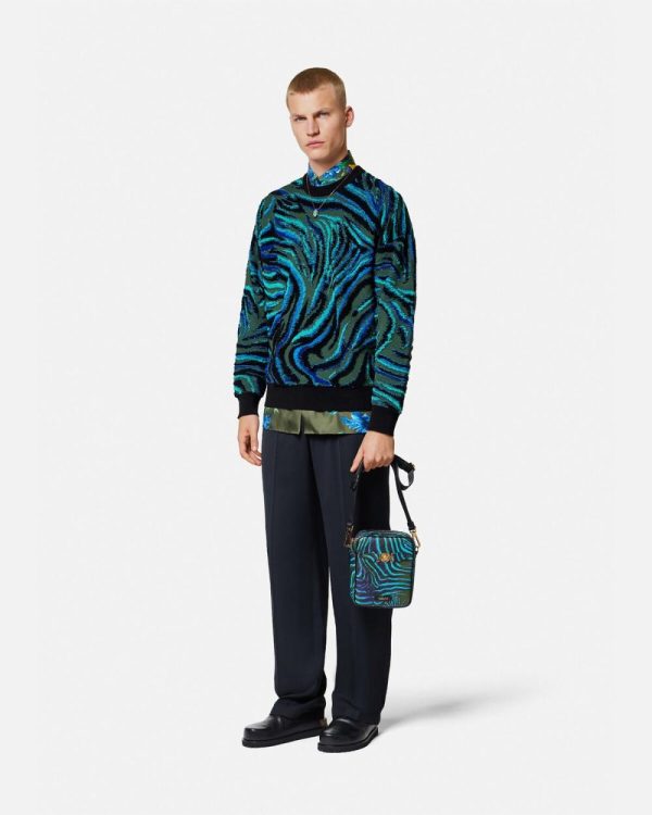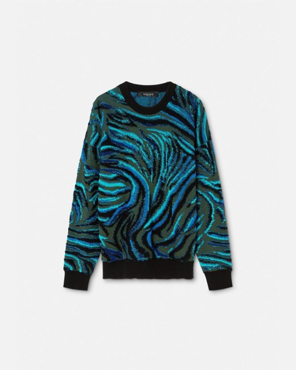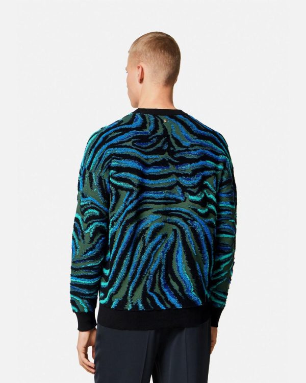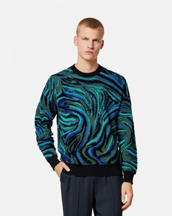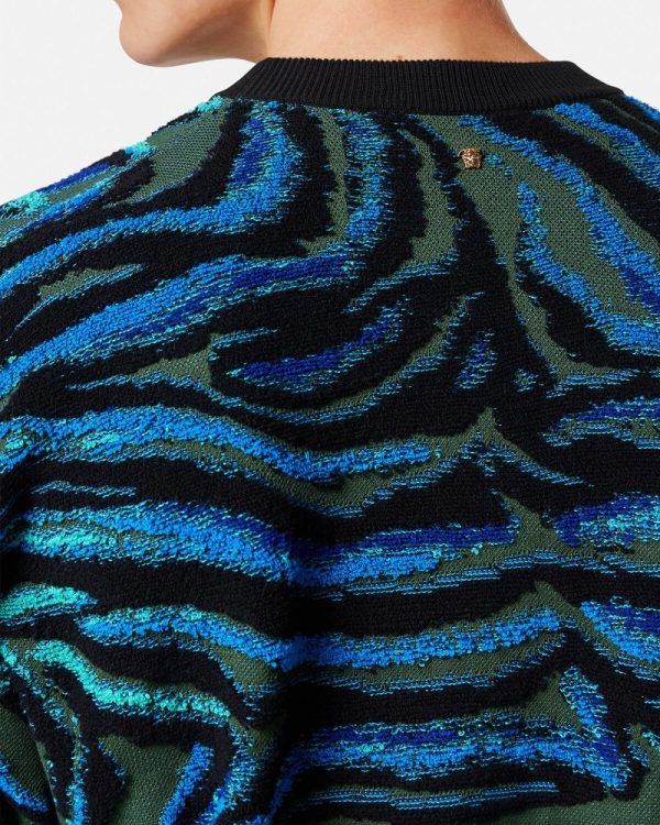 This stretch-knit cotton blend jumper features a contrasting Tiger motif in a textured terry toweling finish. A small Medusa stud accents the back.
