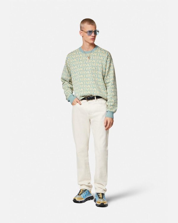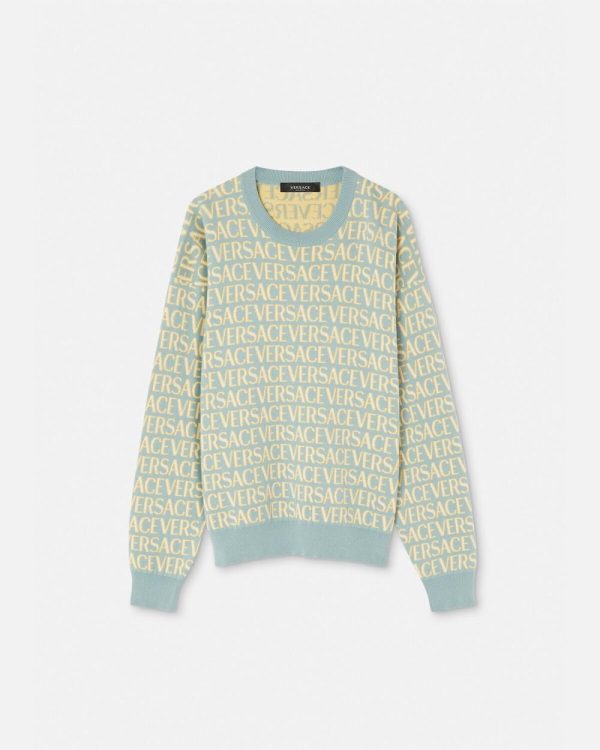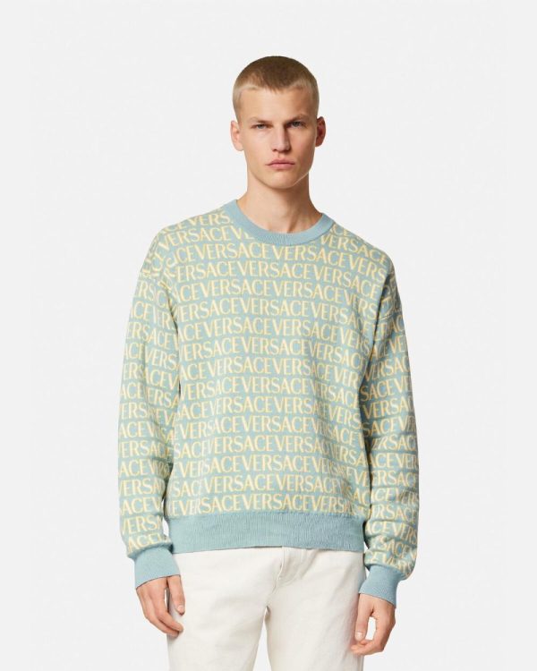 A cotton knit jumper featuring a Versace Allover jacquard motif with contrast outlined lettering.