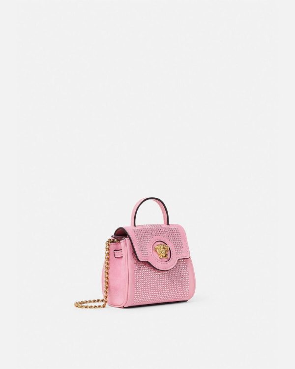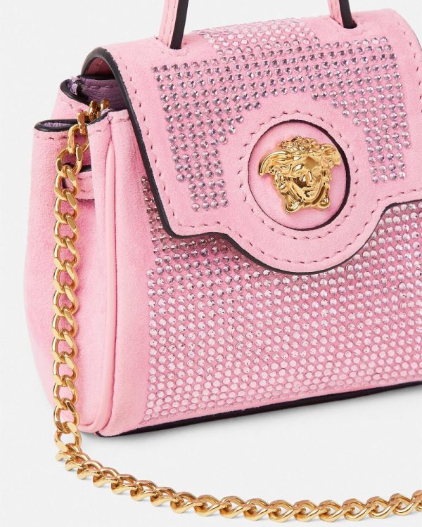 Crafted in Italy from grained leather, this micro handbag bag is adorned by a Medusa plaque with tonal crystals studs throughout. The embellished evening style can be carried in-hand with the small top handle or worn crossbody using the detachable chain strap.