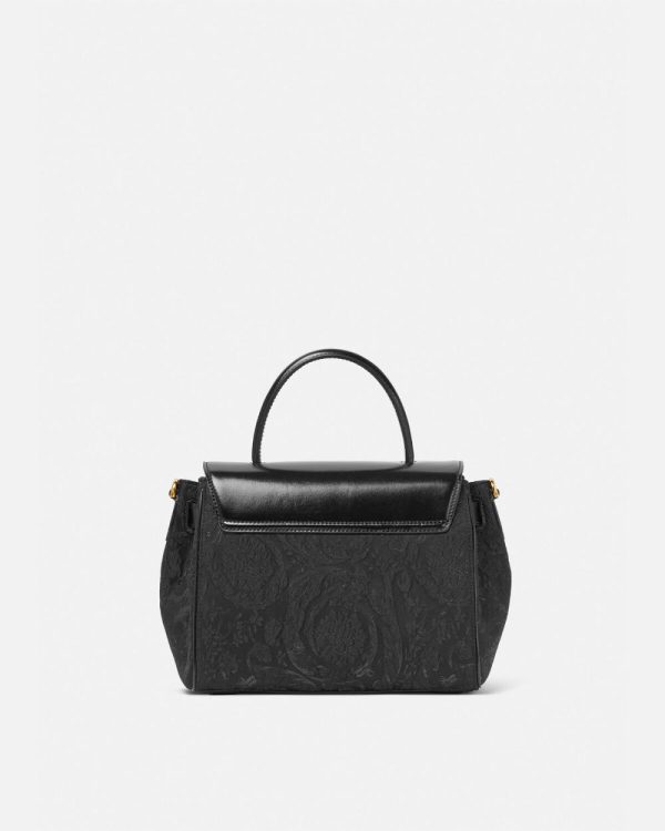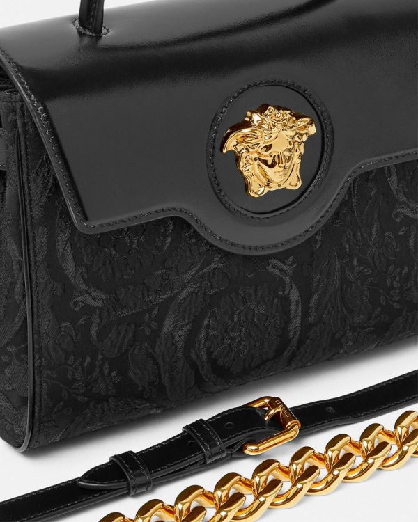 Crafted from a textured, three-dimensional couture-like technique with lurex threading in a Barocco Silhouette pattern, the signature handbag is adorned by a La Medusa detail at the front. The versatile style can be carried in-hand or worn crossbody using the leather shoulder strap.