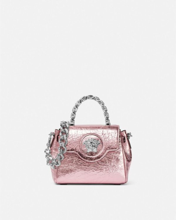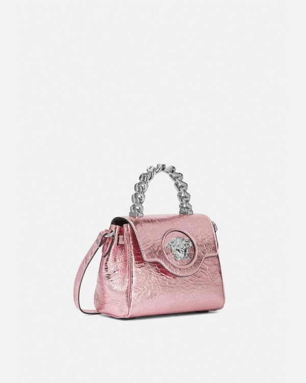 This metallic rendition of the La Medusa handbag features the signature detail, complete with a rigid chain top handle, and an interchangeable leather and chain shoulder straps.