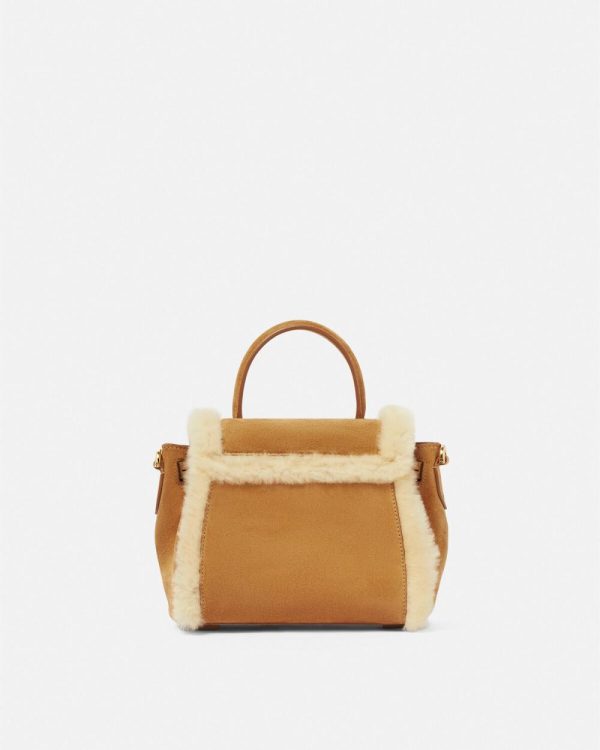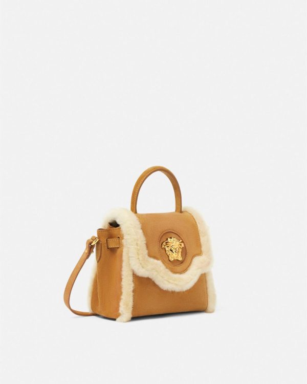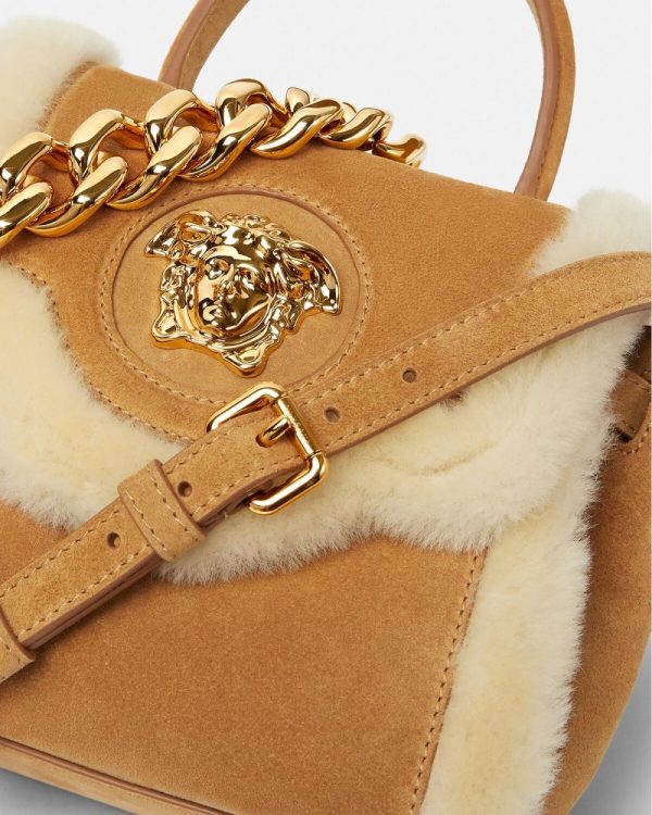 Crafted from suede with shearling trims in, the signature handbag is adorned by a La Medusa detail at the front and shearling trims. The versatile style can be carried in-hand or worn crossbody using the interchangeable chain and leather shoulder straps.