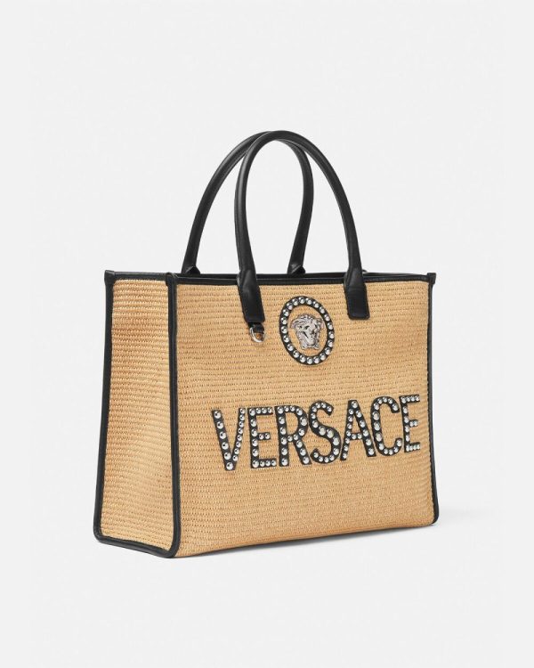This tote bag is crafted from raffia with leather trims and studs. The design is adorned by La Medusa detail and Versace logo. The spacious interior is organized with two zipped pockets and a snap button fastening.