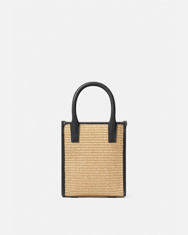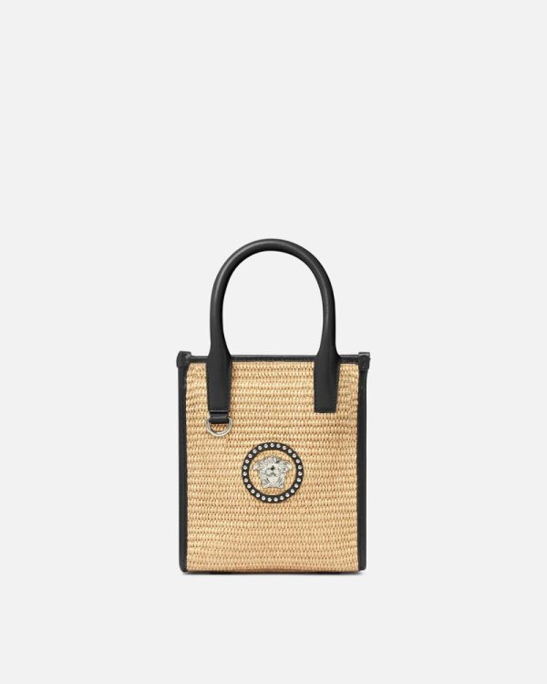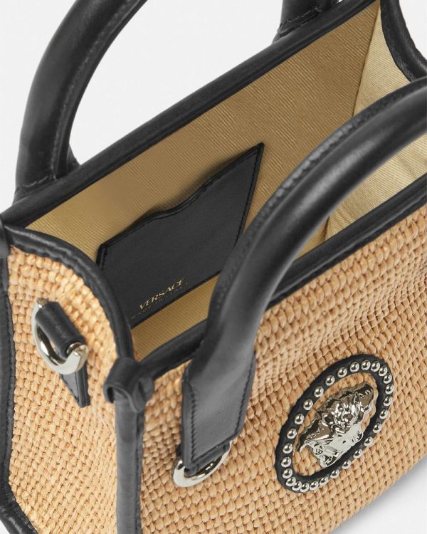 A mini top-handle tote bag crafted from raffia with leather trims and studs. This design features a Medusa detail and can be worn on the shoulder with a detachable leather strap.