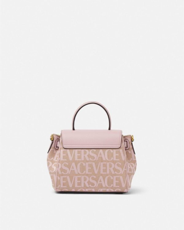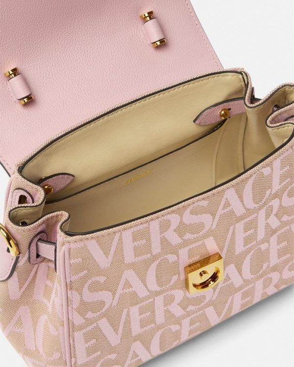 La Medusa handbag is revisited with the jacquard Versace Allover pattern. The signature style is adorned with La Medusa hardware and features an interchangeable leather and chain shoulder strap.