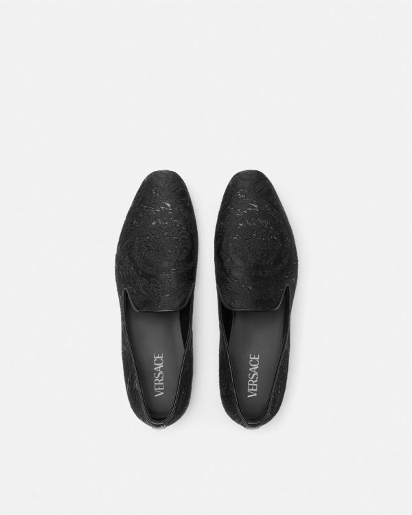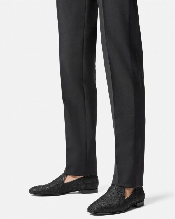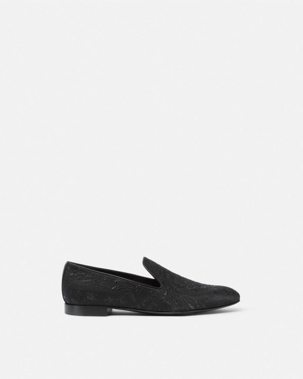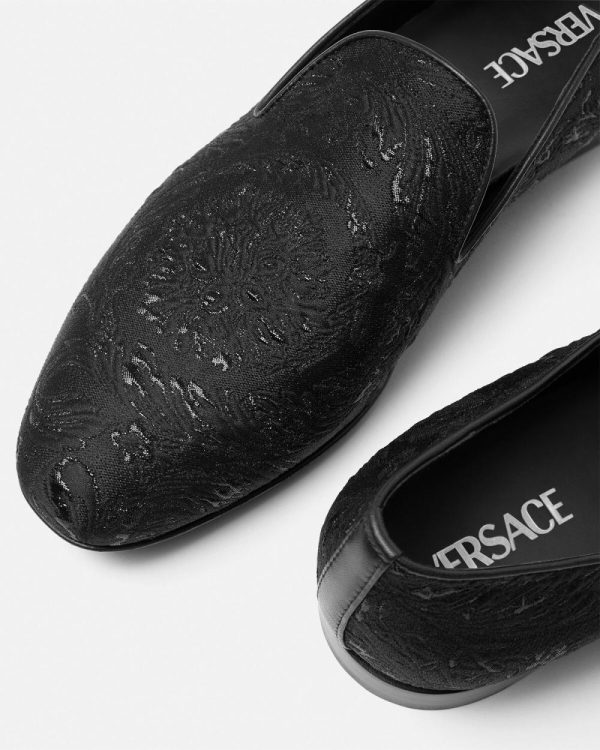 These slippers are crafted in a tonal jacquard Barocco pattern and feature leather piping at the uppers.