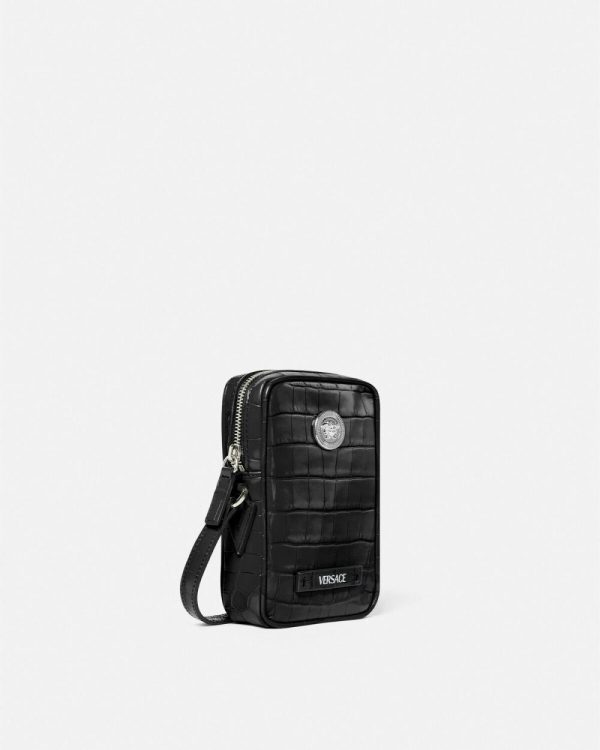 This small crossbody bag is crafted from croc-effect embossed leather and adorned with Medusa Biggie hardware. The design is completed by an adjustable shoulder strap and a front logo label.