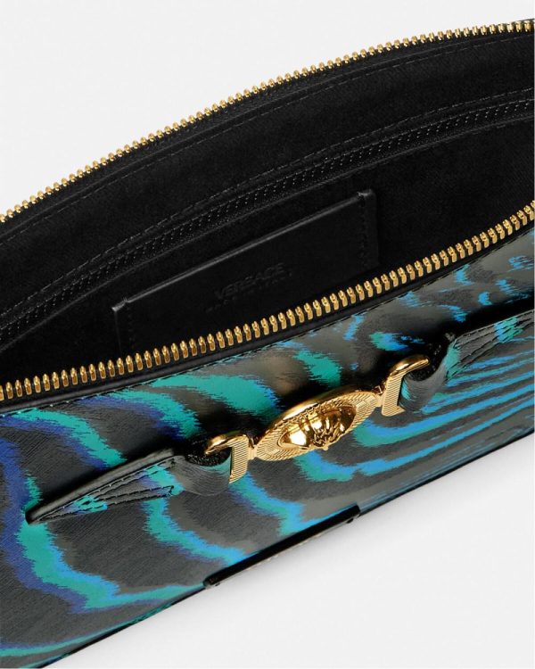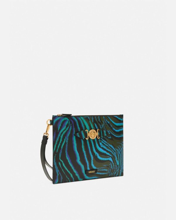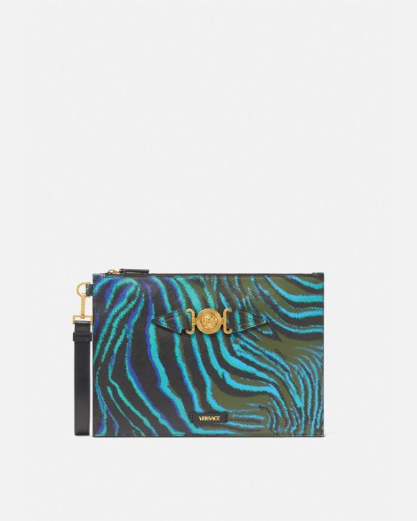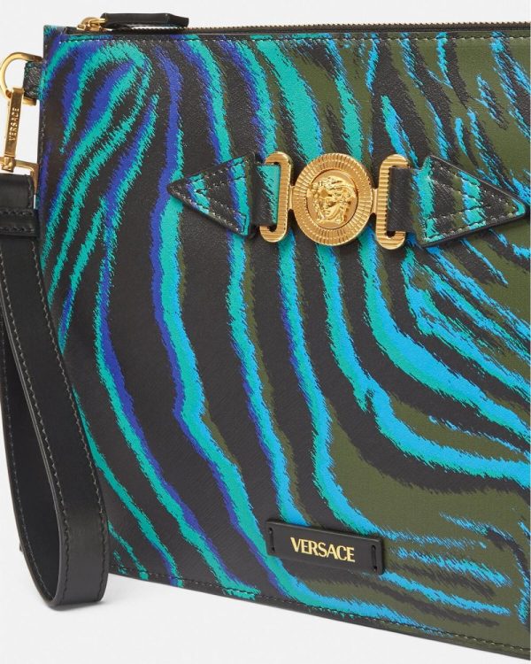 This leather pouch is adorned with the Medusa Biggie hardware, V-shaped detailing, and bright Tiger print. The zipped design features an additional slip pocket for easy access at the back. The style can be carried using the detachable wrist strap.