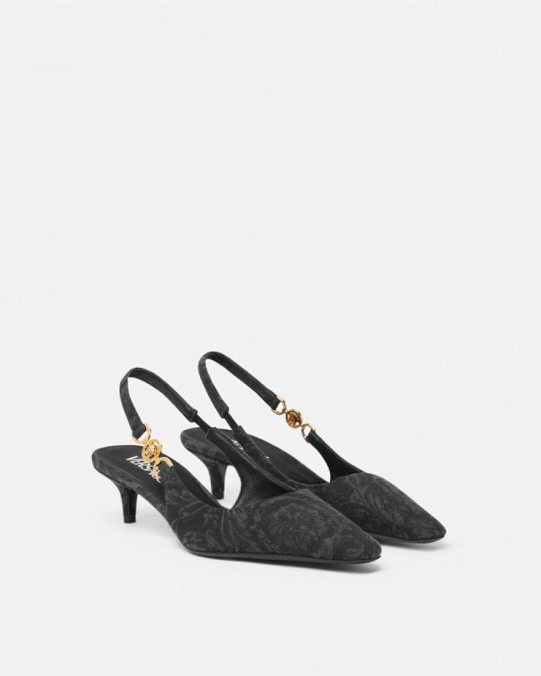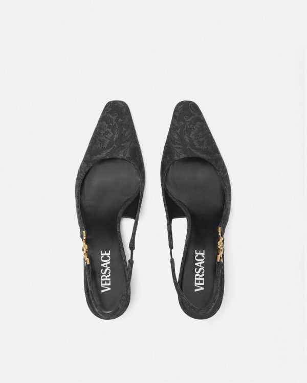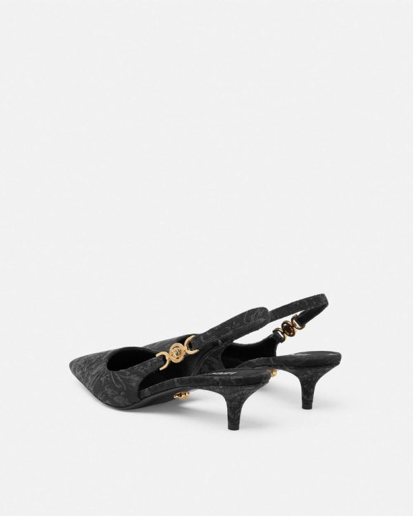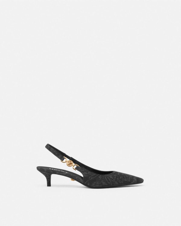 Low-heeled slingback pumps crafted from jacquard Barocco canvas, featuring accent Medusa ’95 hardware at the strap.