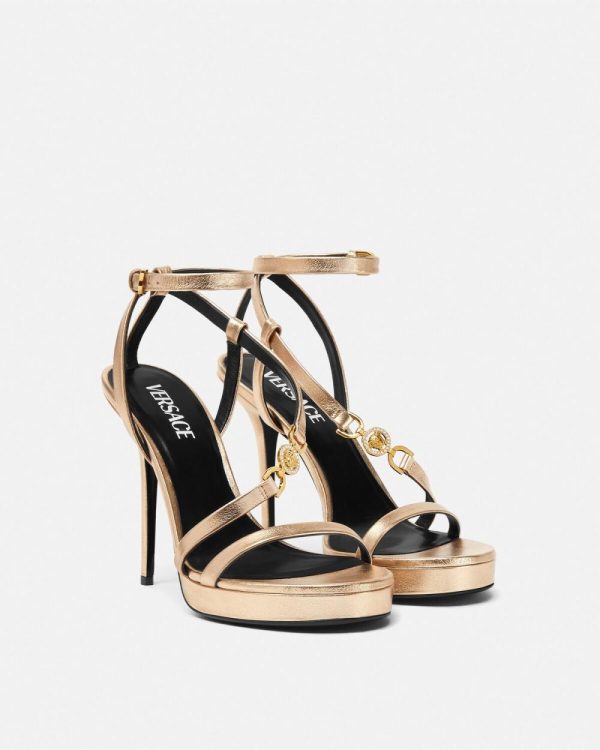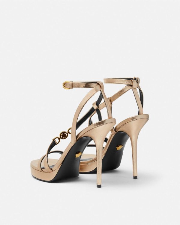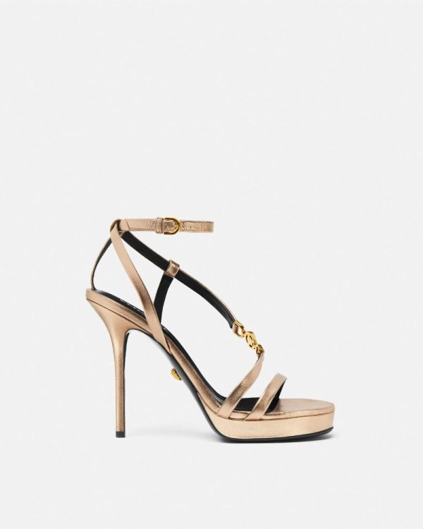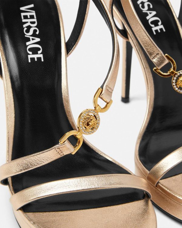 These high-heeled leather sandals have a metallic finish featuring a slingback strap and a diagonal front strap with crystal-embellished Medusa ’95 hardware. The strappy design is finished with a round toe set on a low platform front.