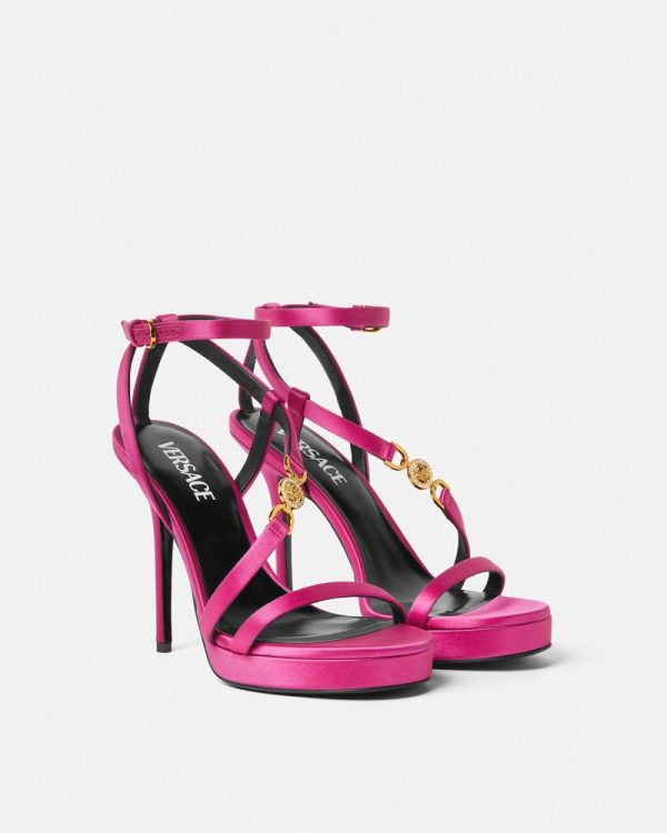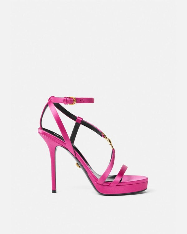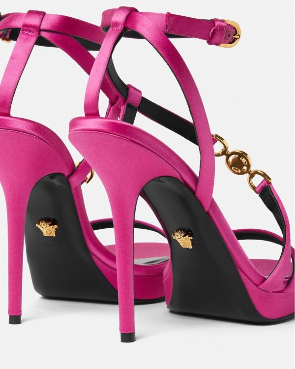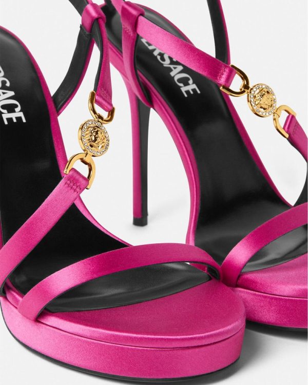 These high-heeled satin sandals feature an ankle strap with buckle closure and a diagonal strap accented by a crystal embellished Medusa ’95 hardware. The strappy design is finished with round toe and a small plateau.
