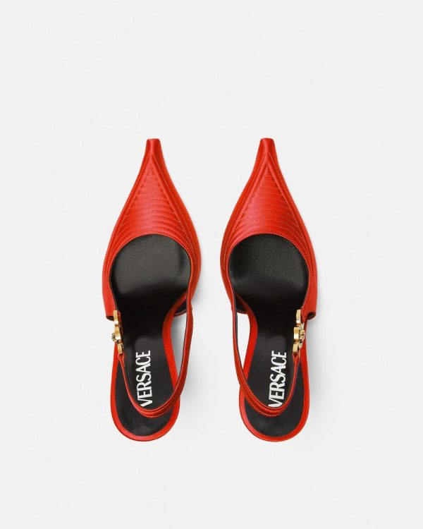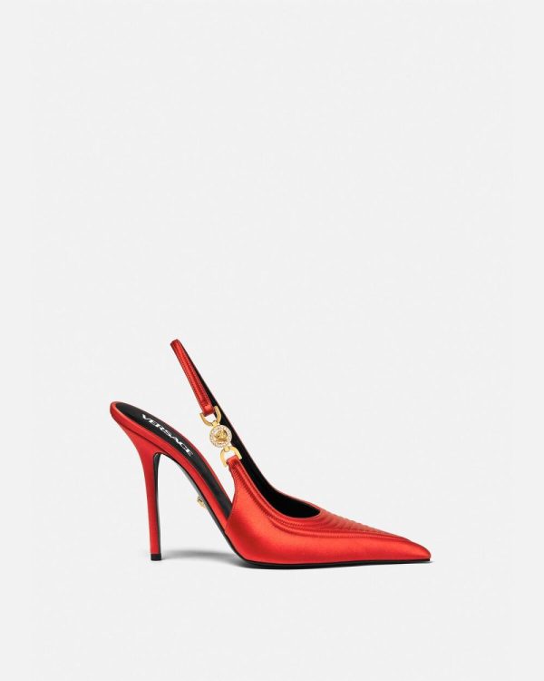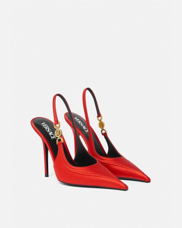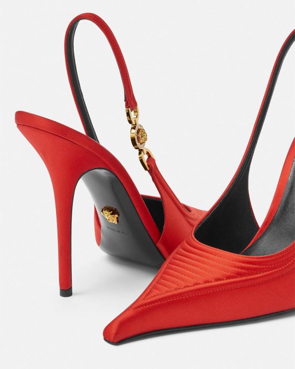 These slingback satin pumps are characterized by sharp, slightly curved pointed toe and are accented by a crystal embellished Medusa ’95 hardware and a stitching detailing on the uppers inspired by Versace corsets.