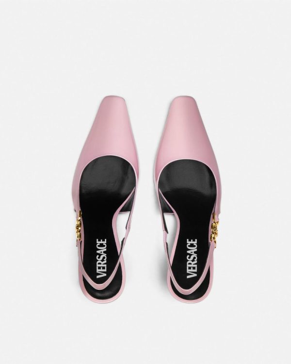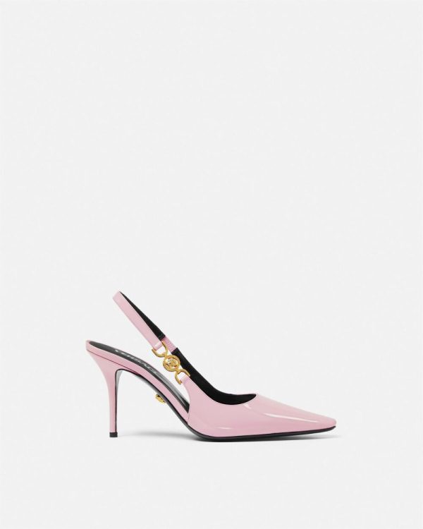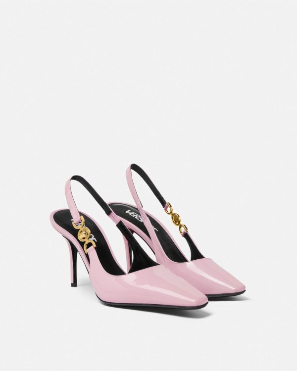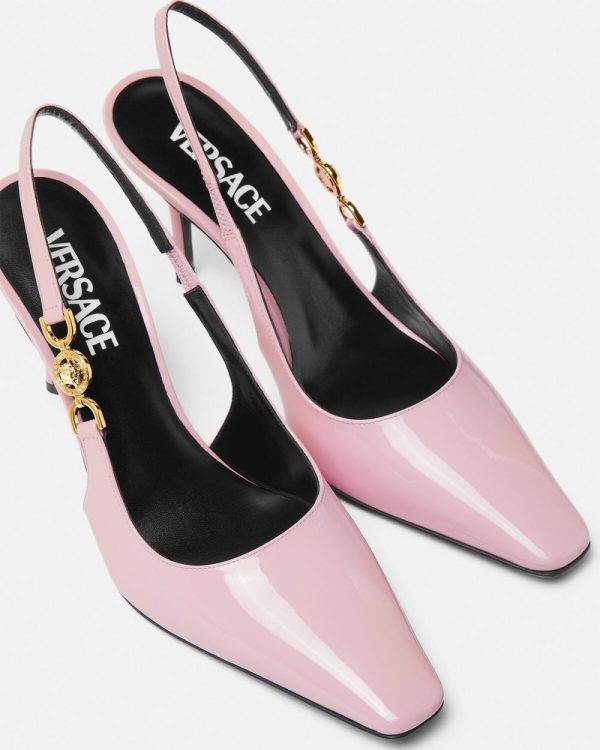 These mid-heel pumps are made from patent leather with a squared toe and a Medusa ’95 emblem at the slingback strap.