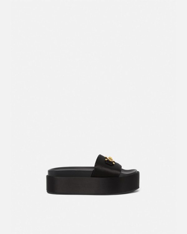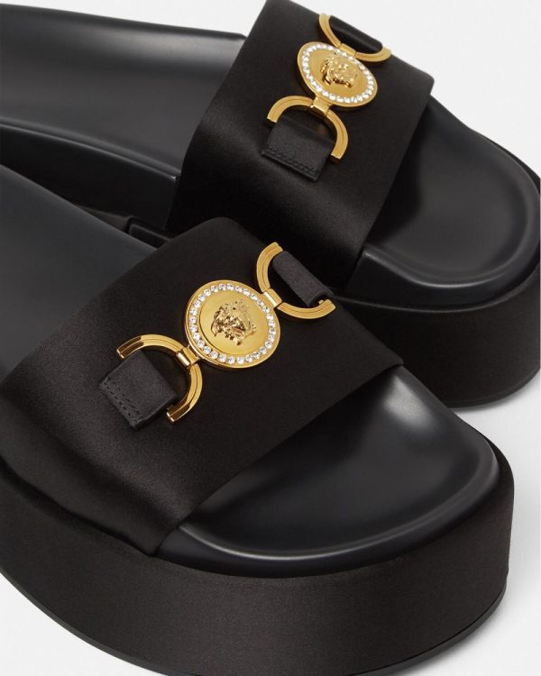 These satin sandals are enriched with a crystal-embellished Medusa ’95 emblem and are set on a platform sole.