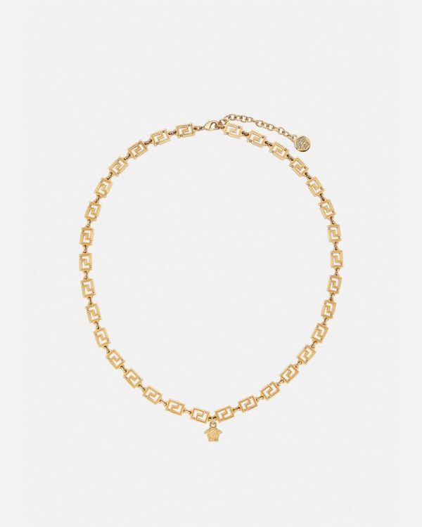 An open-work Greca necklace featuring a small Medusa charm. All Versace jewelry products are lead and nickel free. All materials are hypoallergenic.