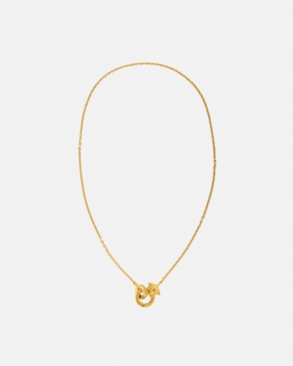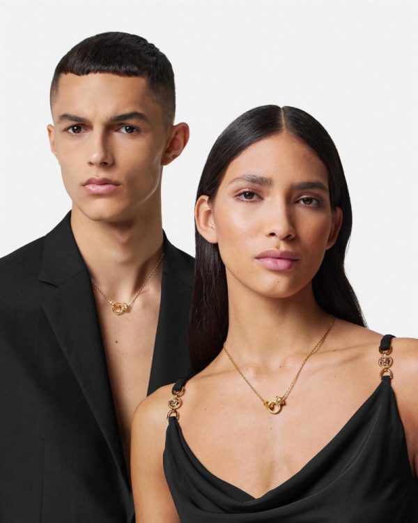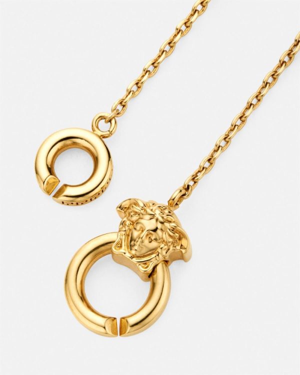 A thin necklace featuring a Medusa emblem and a ring closure. To fasten the necklace, slide one ring into the other, and rotate the larger ring until the slit opening is hidden inside the Medusa charm. This will allow the necklace to stay on securely. All Versace Jewelry products are lead and nickel-free. All the materials are hypoallergenic.