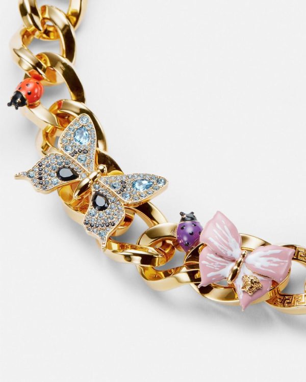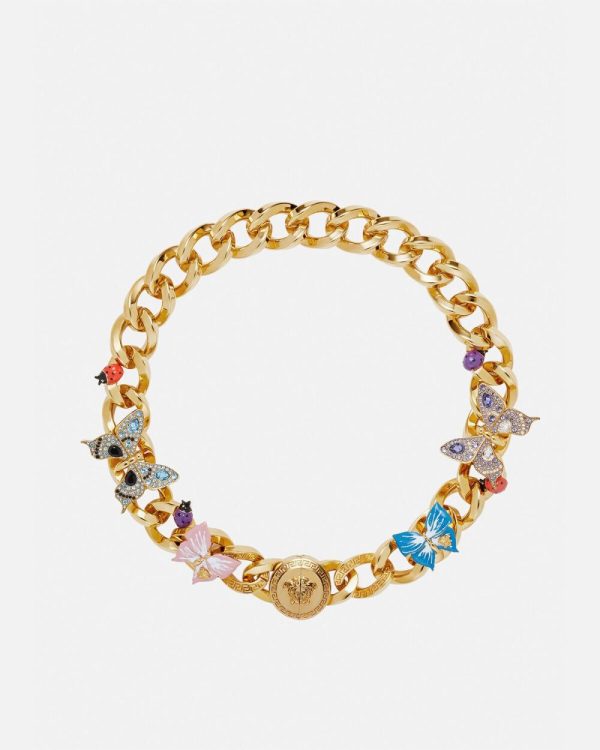 Versace presents Dua Lipa x Versace – a capsule collection co-designed with Dua Lipa. This wide chain-linked necklace features crystal and enamel butterflies, enamel ladybugs, and a sliding magnetic Medusa closure. Each piece is unique and may vary slightly from the picture shown due to its hand-appliquéd and hand-painted quality. All Versace jewellery products are lead and nickel free. All the materials are hypoallergenic.