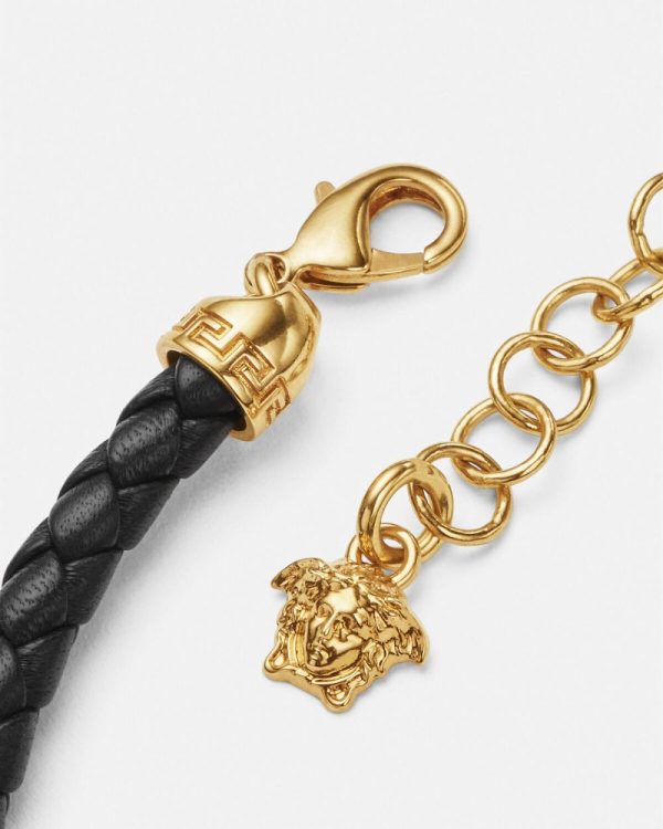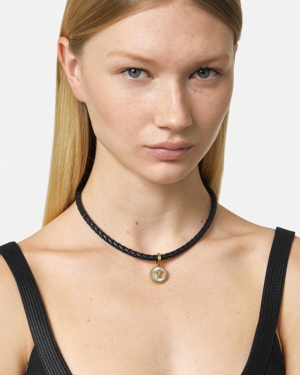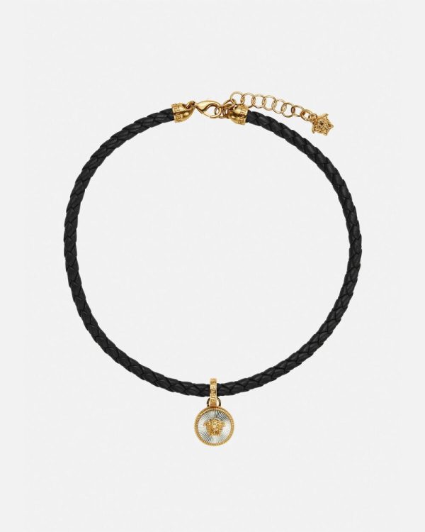 A woven leather necklace featuring a Medusa Biggie charm with Greca engravings and an adjustable chain. All Versace jewelry products are lead and nickel free. All materials are hypoallergenic.
