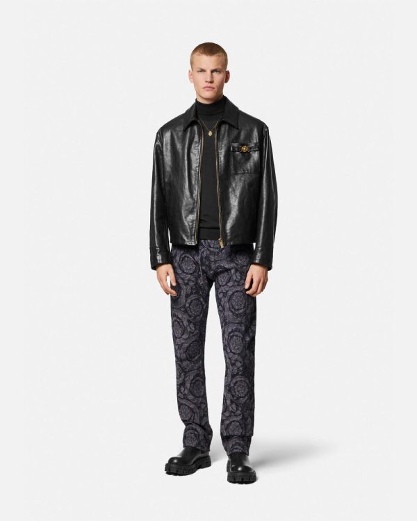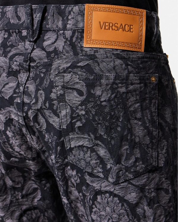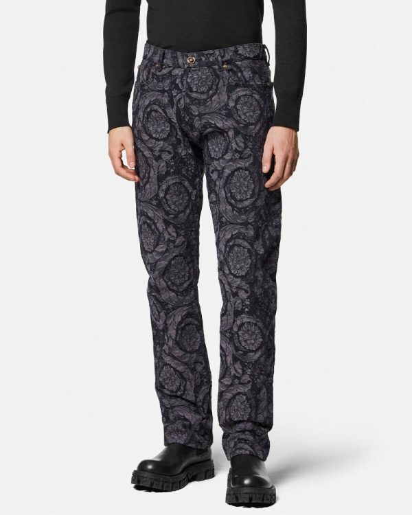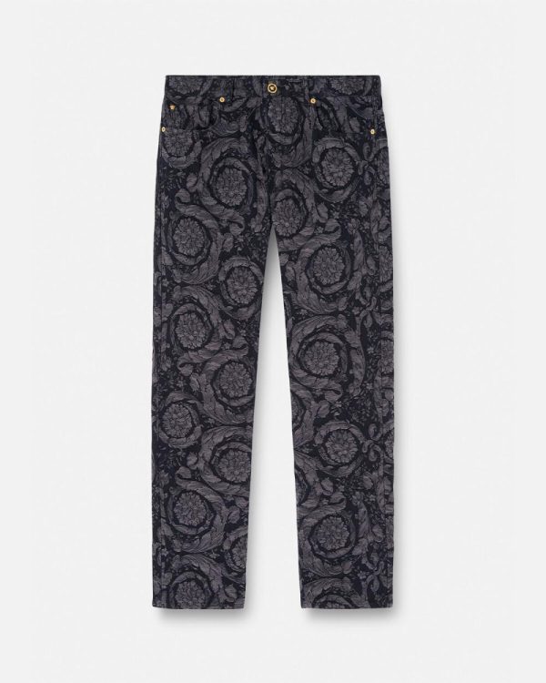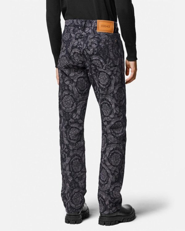 These jeans are crafted in a jacquard Barocco Silhouette pattern and have a five-pocket design with Medusa hardware.