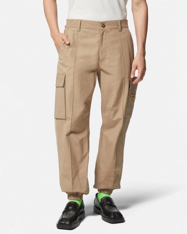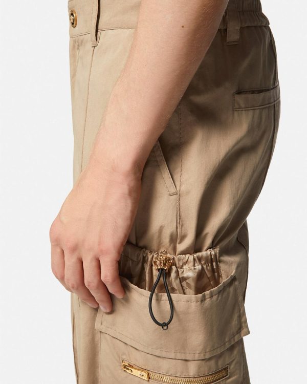 These utilitarian-inspired elastic cargo pants are accented by enamel Medusa buttons and feature a novelty, movable Medusa drawstring with a tonal La Greca printed pocket.