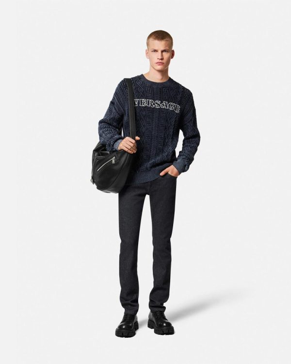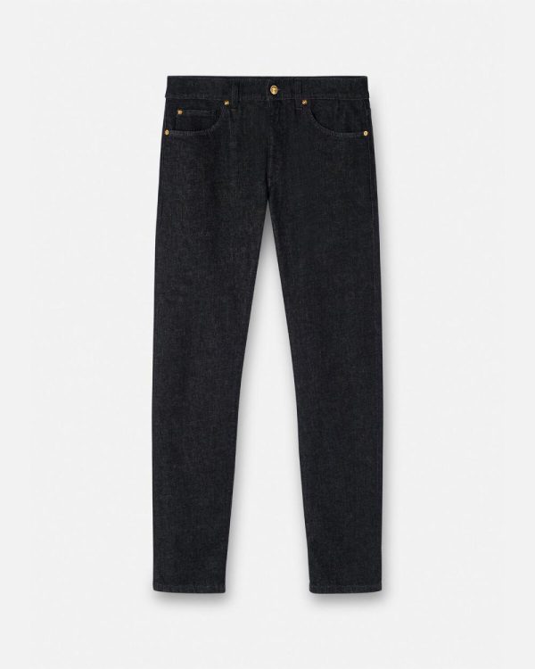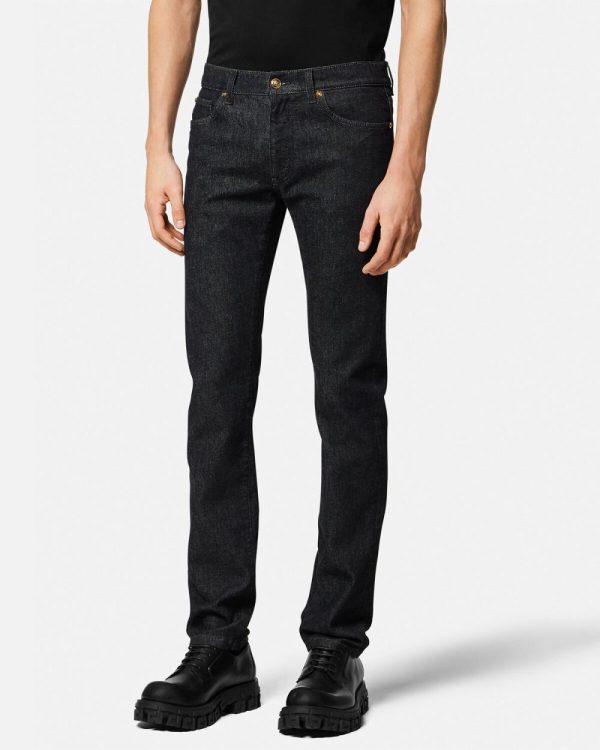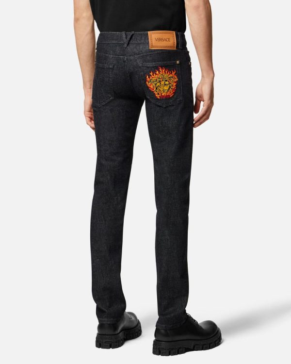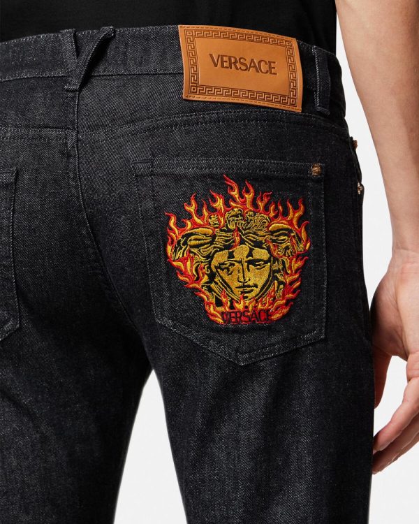 These slim-fit jeans feature a Medusa Flame embroidery on the back patch pocket and are detailed with Medusa hardware.