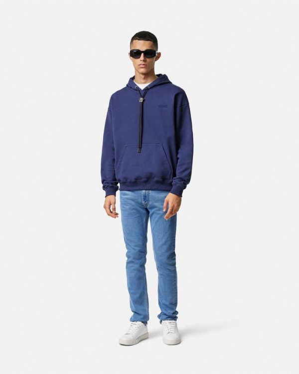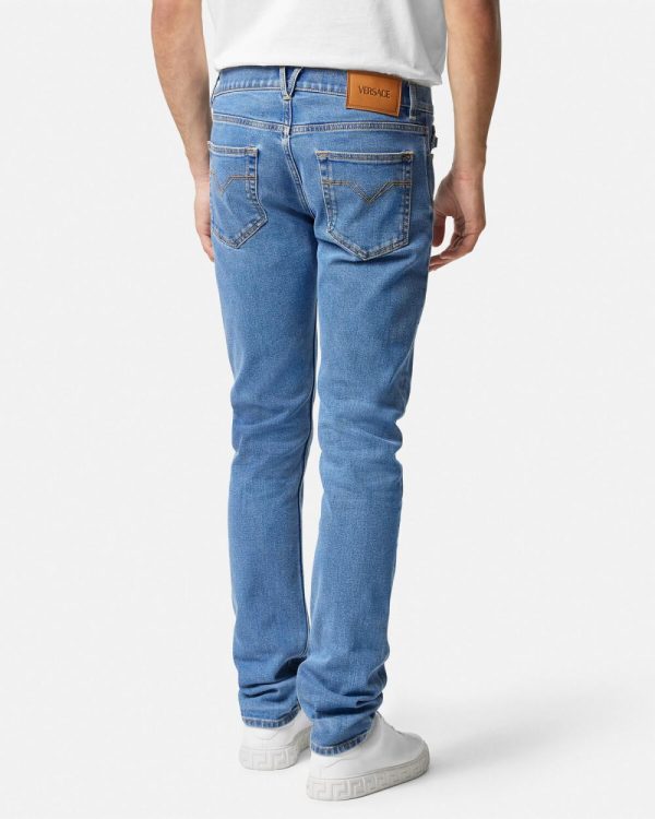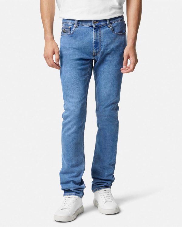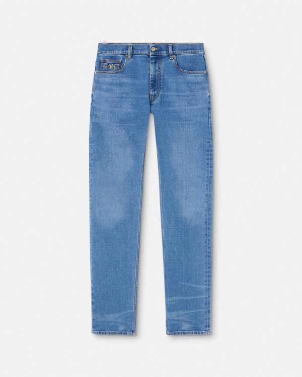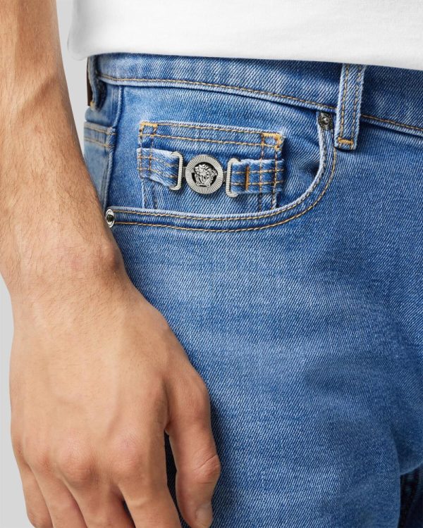 These medium-washed Slim Fit jeans are made from cotton denim featuring a Medusa Biggie hardware at the front pocket.