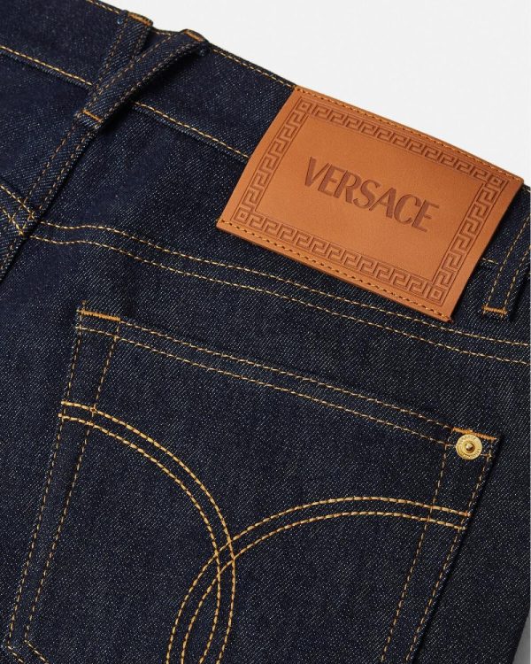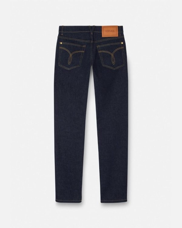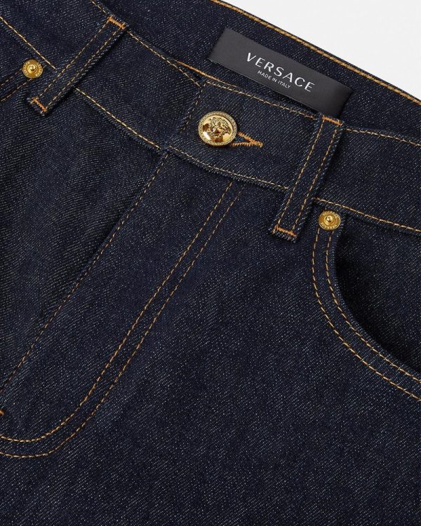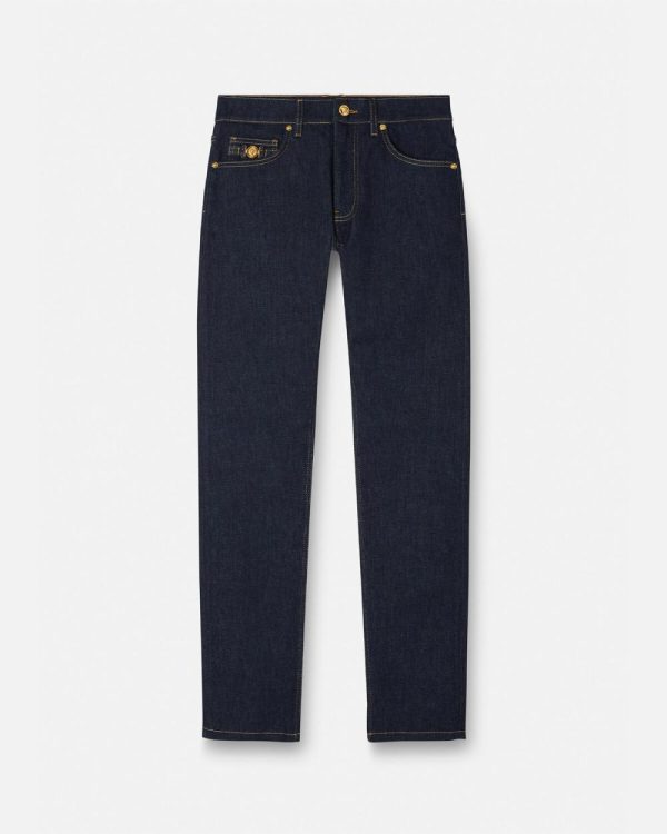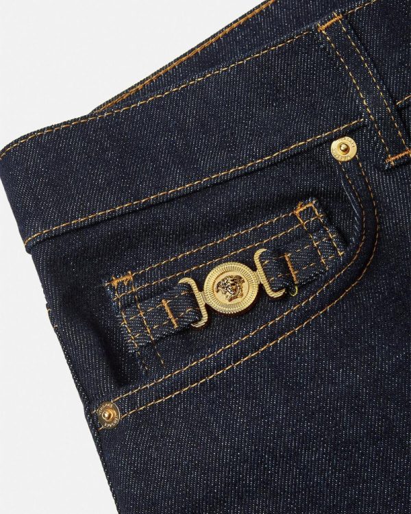 These slim-fit jeans are made from cotton denim, featuring a Medusa Biggie emblem at the pocket and an enamel Medusa button.
