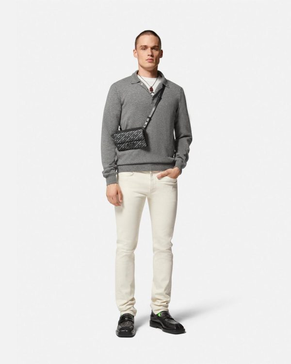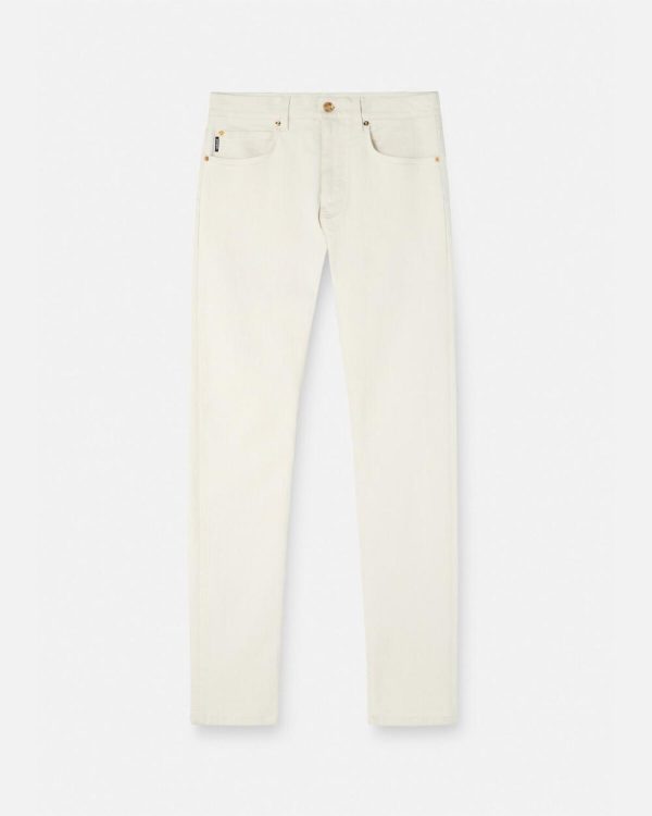 In a stretch cotton denim, these slim-fit jeans feature a five-pocket design with a three-dimensional Medusa hardware at the back.