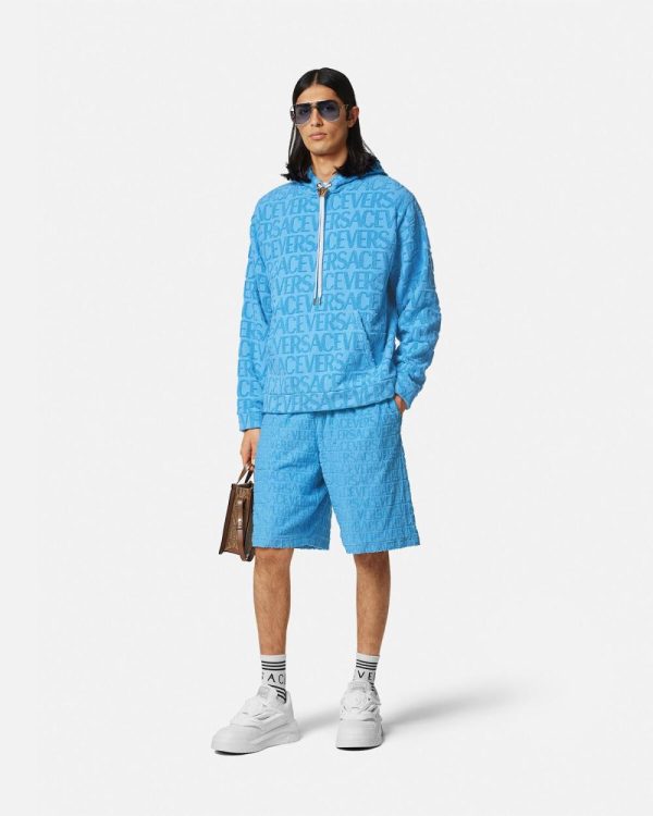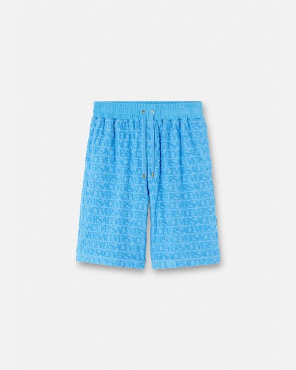 These ready-to-wear knee-length shorts are made in a terry towelling cotton featuring a textured Versace Allover pattern. The fully lined style is detailed with a drawstring waistband.