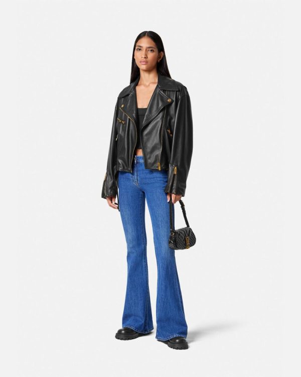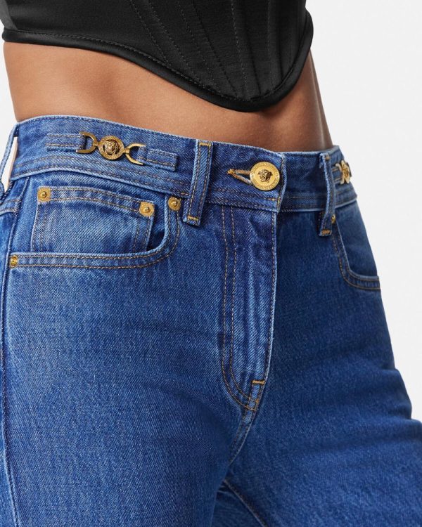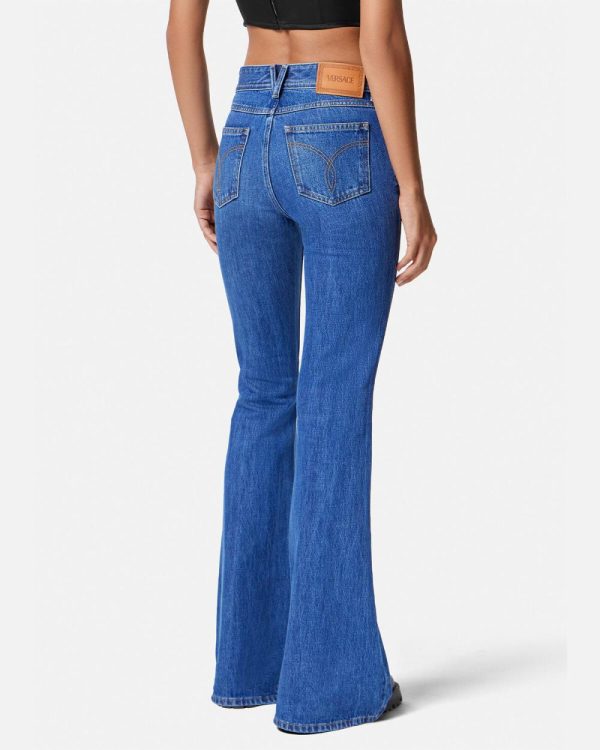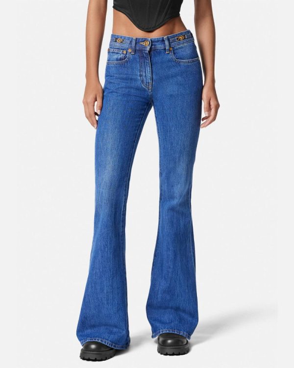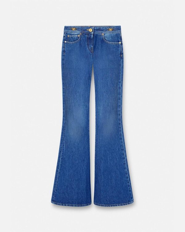Flared denim jeans accented by the Medusa ’95 hardware at the waistband with a five-pocket design.