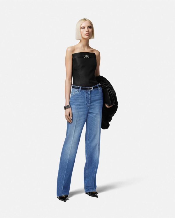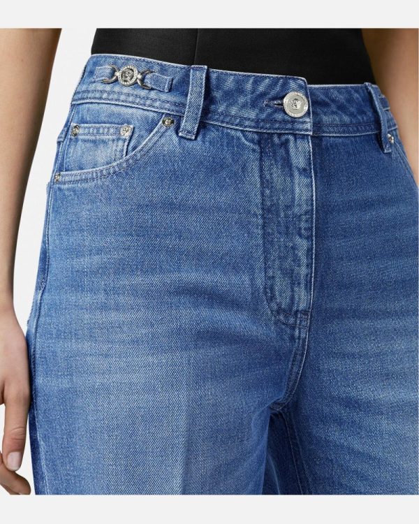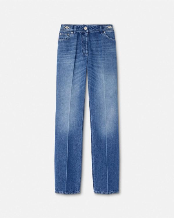 These medium-wash jeans are made from cotton denim with a tailored front pleat and have a boyfriend cut. Medusa ’95 hardware accents the waistband.