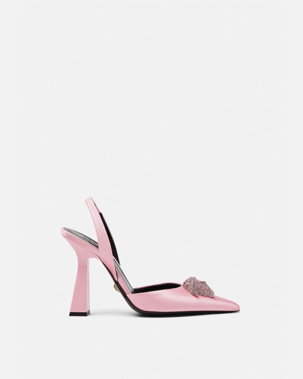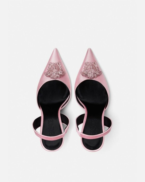 Effortlessly elegant, these slingbacks are crafted from smooth satin. The sleek pointed toe silhouette is adorned with a fully crystal-encrusted Medusa plaque—the iconic décor found on the doors of the brand’s first headquarters in Milan.
