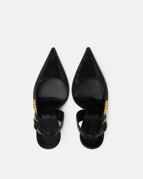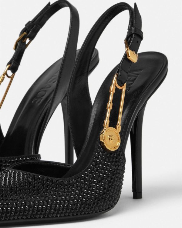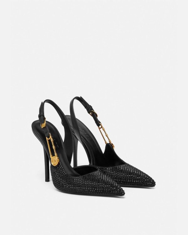 These pointed-toe high-heel slingbacks are crafted from leather with all-over crystal embellishments and Versace’s signature Safety Pin.