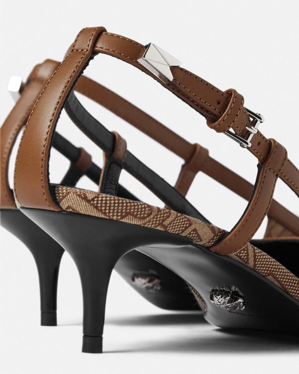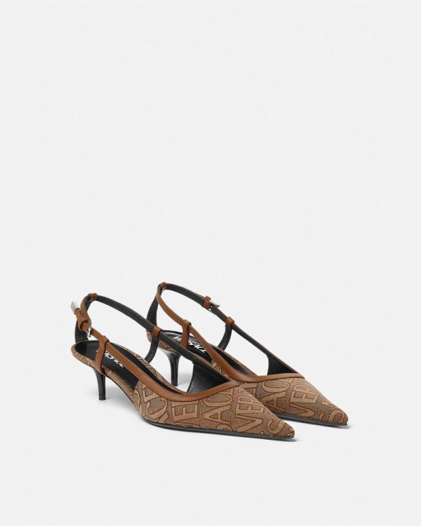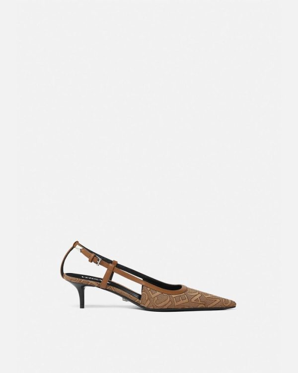 These sling-back pumps feature a Versace Allover jacquard pattern and are set on a low heel with pointed toes.
