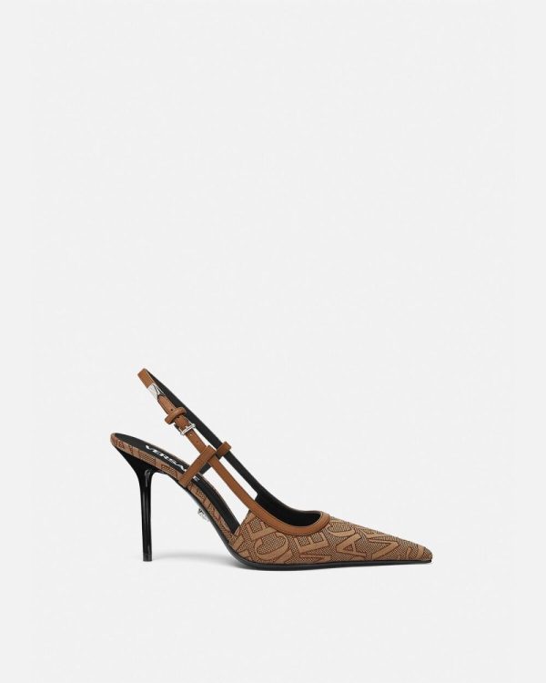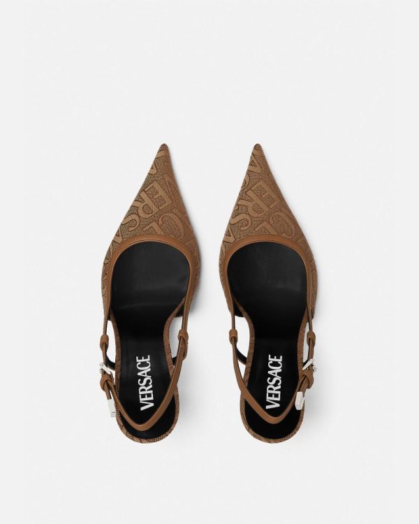 These sling-back pumps are crafted from a Versace Allover jacquard canvas with leather trims, featuring a high-heeled design and pointed toes.