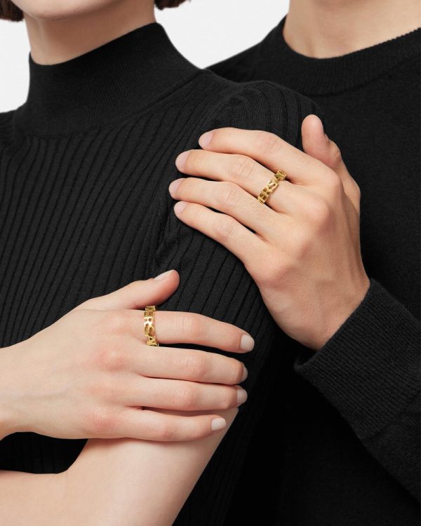 A Very Versace finishing touch, this band ring features an openwork with logo lettering. All Versace jewellery products are lead and nickel free. All materials are hypoallergenic.