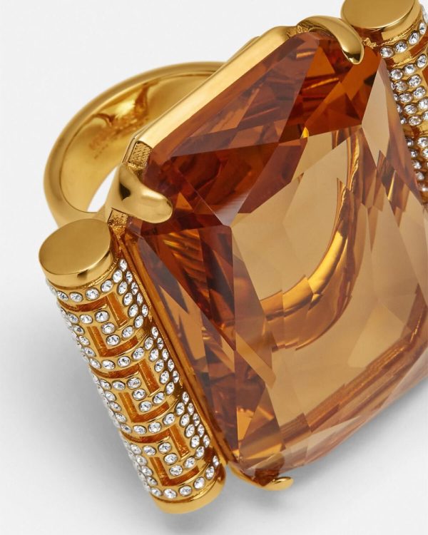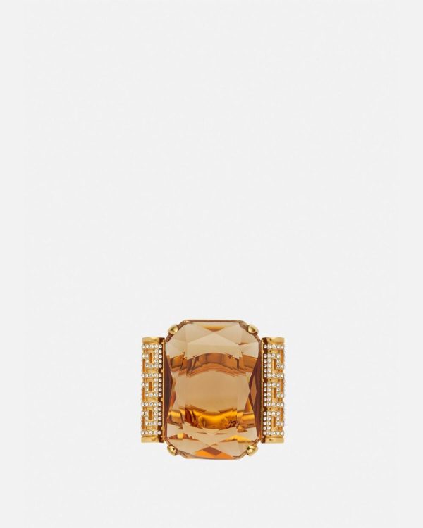 A ring featuring a central emerald cut stone and lateral crystal embellished Greca motifs. All Versace jewellery products are lead and nickel free. All materials are hypoallergenic