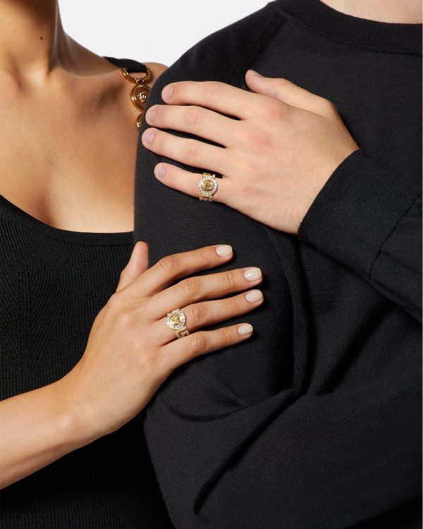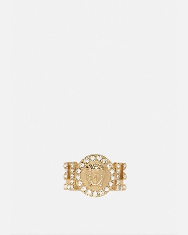 A crystal-embellished ring featuring a central three-dimenisonal La Medusa. All Versace jewelry products are lead and nickel free. All materials are hypoallergenic.
