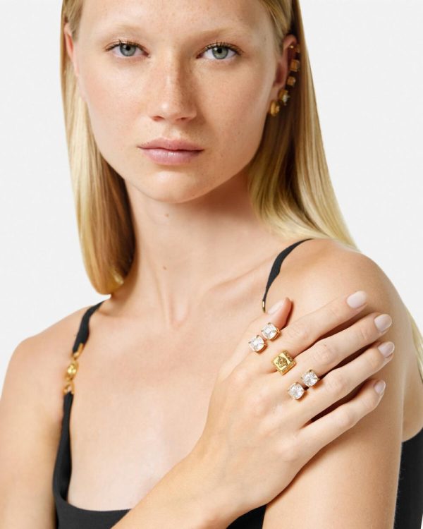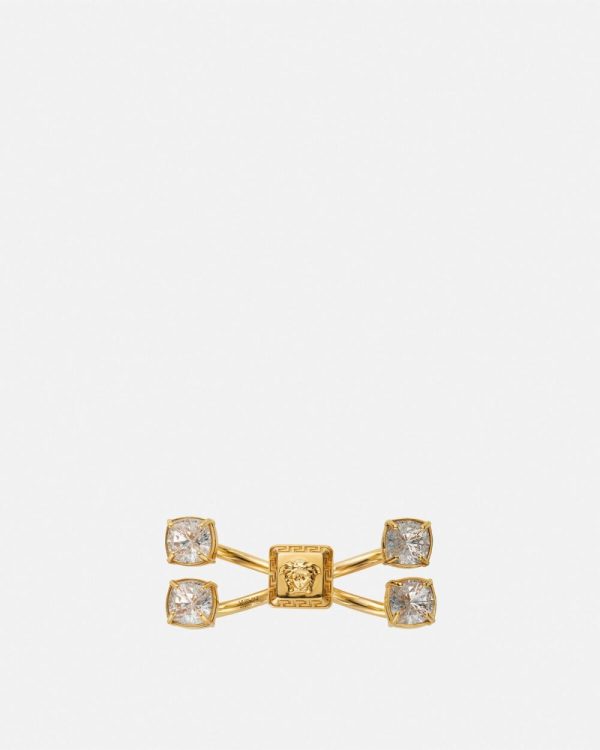 Cuff ring with floating crystal studs and a squared central Medusa emblem. All Versace jewelry products are lead and nickel-free. All materials are hypoallergenic.