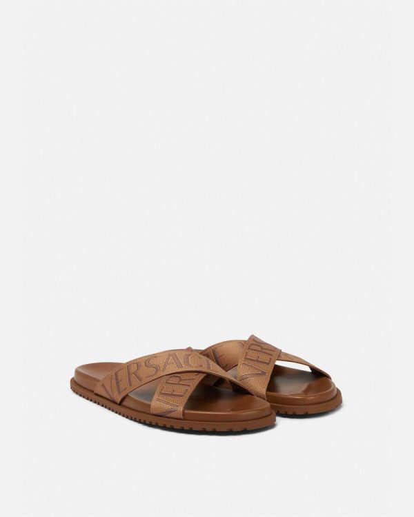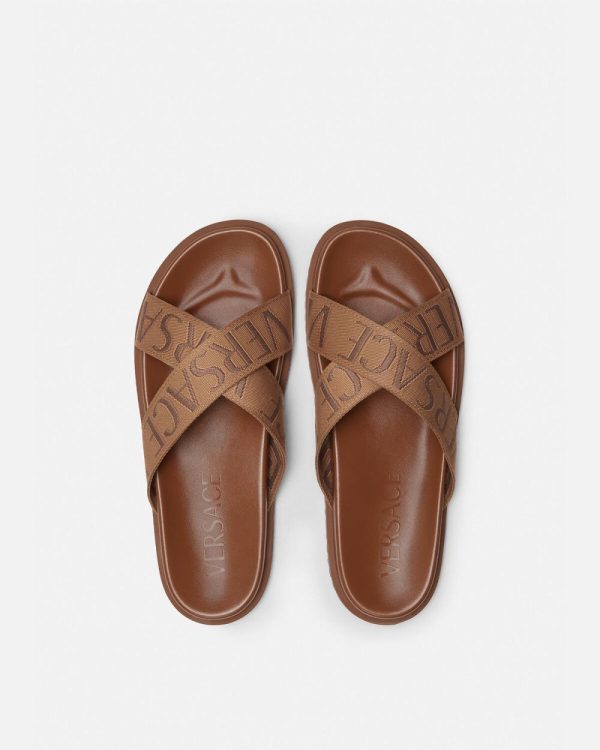 These open-toe sandals feature jacquard crisscross straps with a tonal Versace Allover pattern. This design is set on comfortable moulded soles.