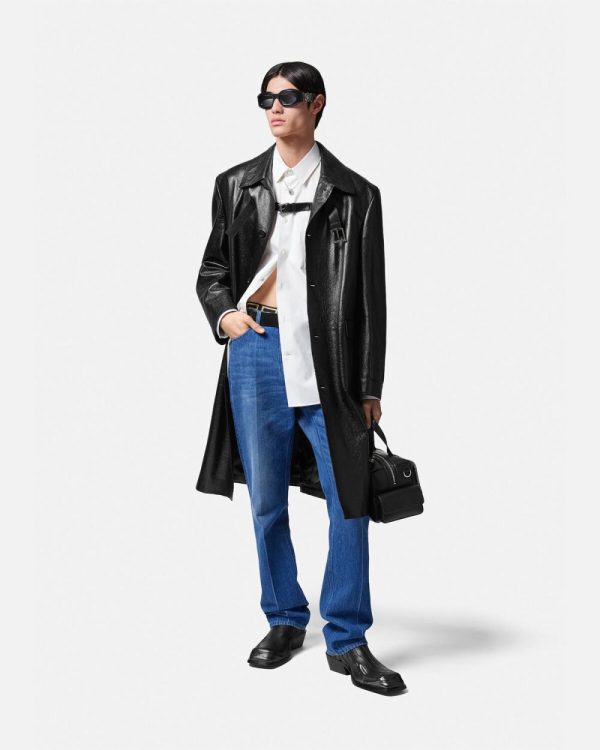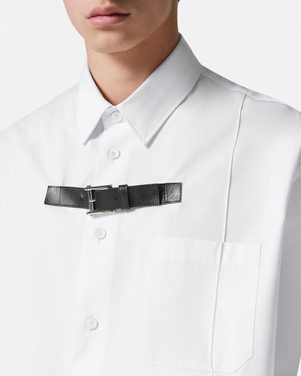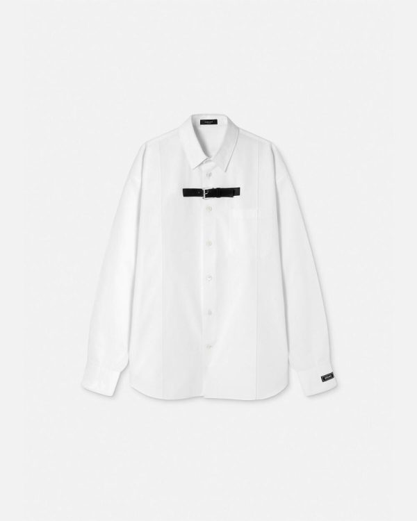 This long-sleeved cotton poplin shirt has mother-of-pearls button closures and front buckle closure with a tailoring label at the cuff sleeve.