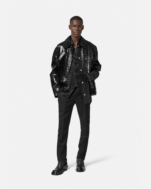 This long-sleeved button-down shirt is made in a semi-transparent silk devoré with a tonal crocodile pattern.