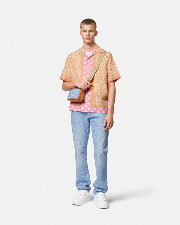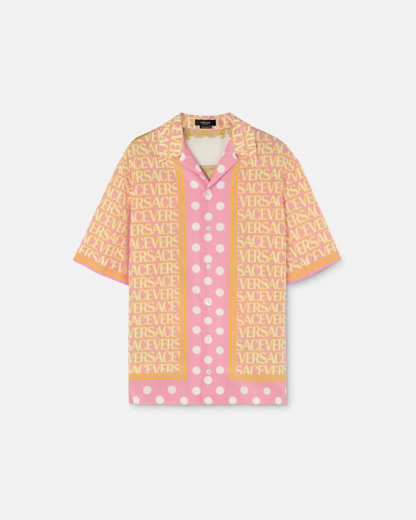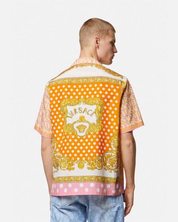 A button-down short-sleeved cotton poplin and silk blend shirt featuring the Versace Allover Polka Dot print at the front and a Seashell Baroque Polka Dot printed panel at the back.