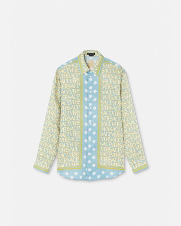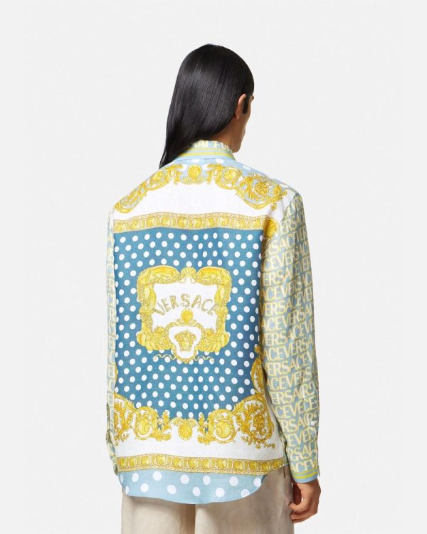 This long-sleeved shirt is made from linen featuring the Versace Allover print at the front and a Seashell Baroque print insert at the back with a polka dot background.