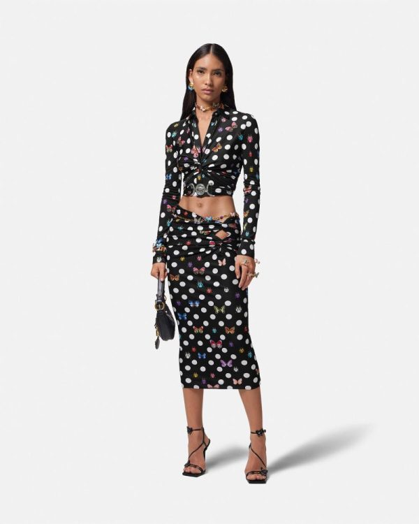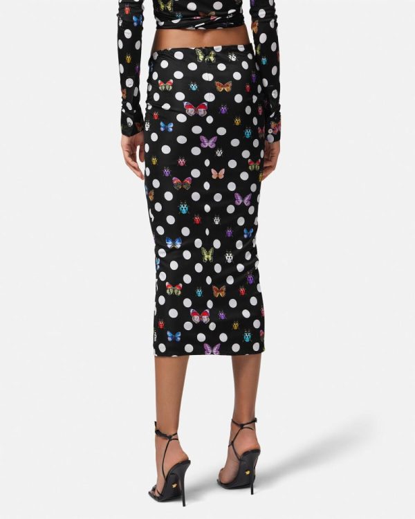 A polka dot fluid jersey midi skirt featuring a butterflies and ladybugs print with draped, cutout knot detailing at the front. This item is part of the capsule collection co-designed with Dua Lipa.