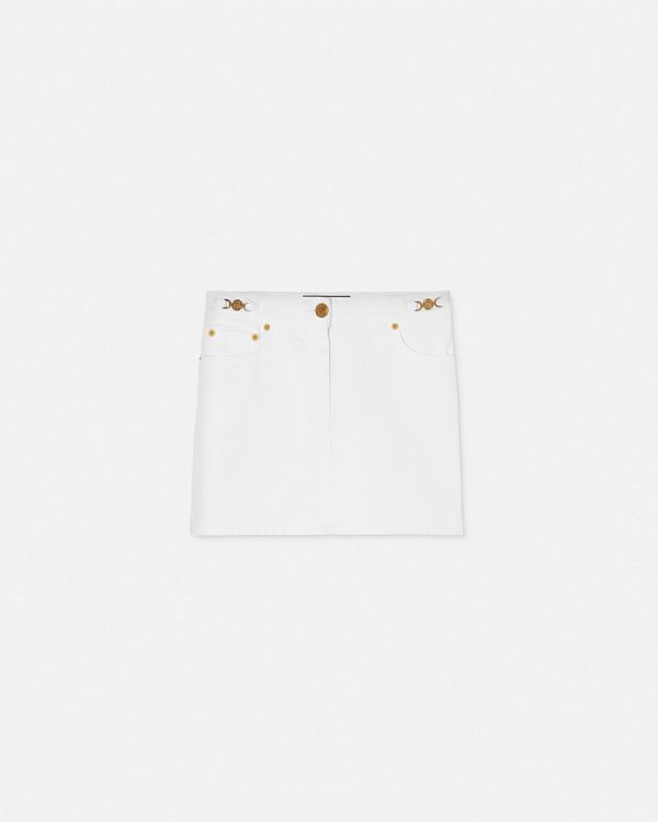 A denim mini skirt accented by Medusa ’95 hardware at the waist, Medusa buttons, and a five-pocket design. This item is part of the capsule collection co-designed with Dua Lipa.