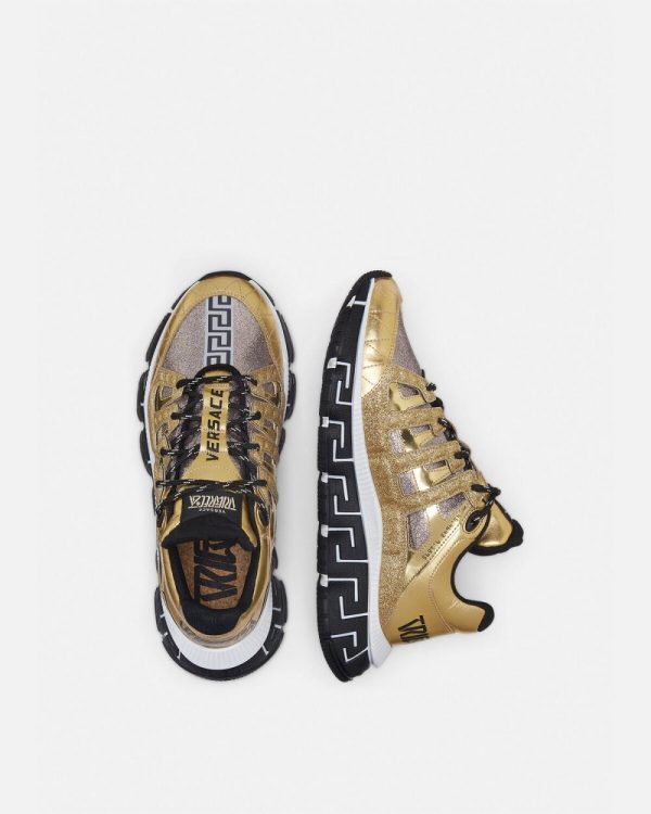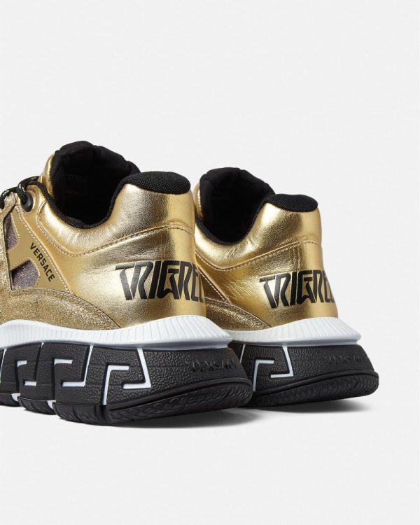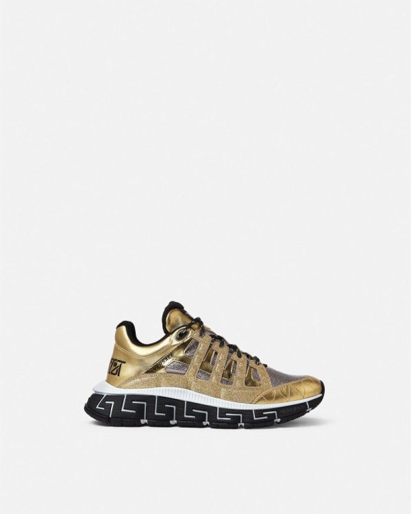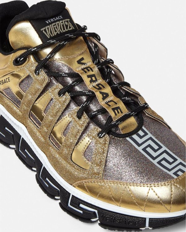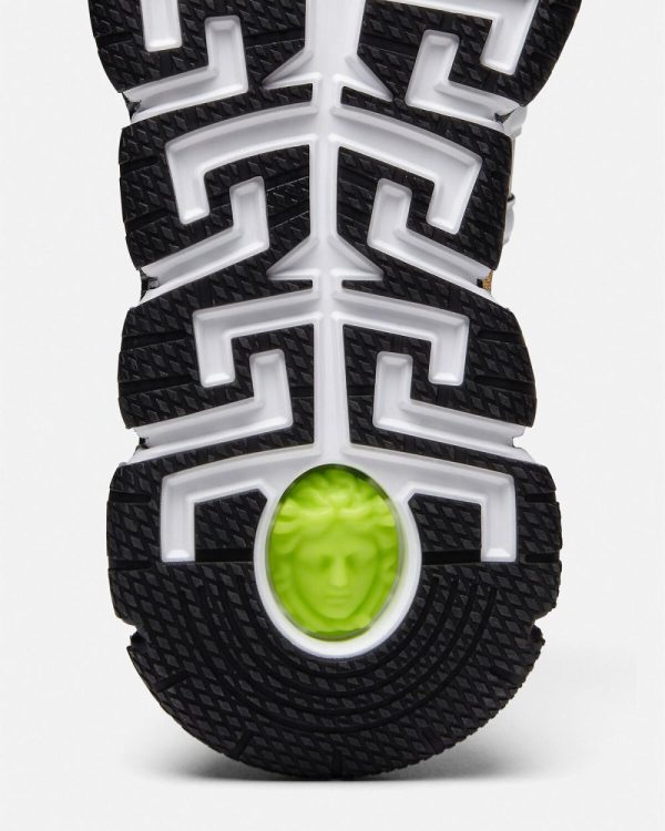 The Trigreca trainers bring innovation to the brand’s ever-evolving aesthetic. Three-dimensional Greca executions on the soles offer an impactful landing with the “Greca Cushioning System.” In a subtle nod to Versace’s home city, the uppers have a discrete print of Milan’s coordinates.